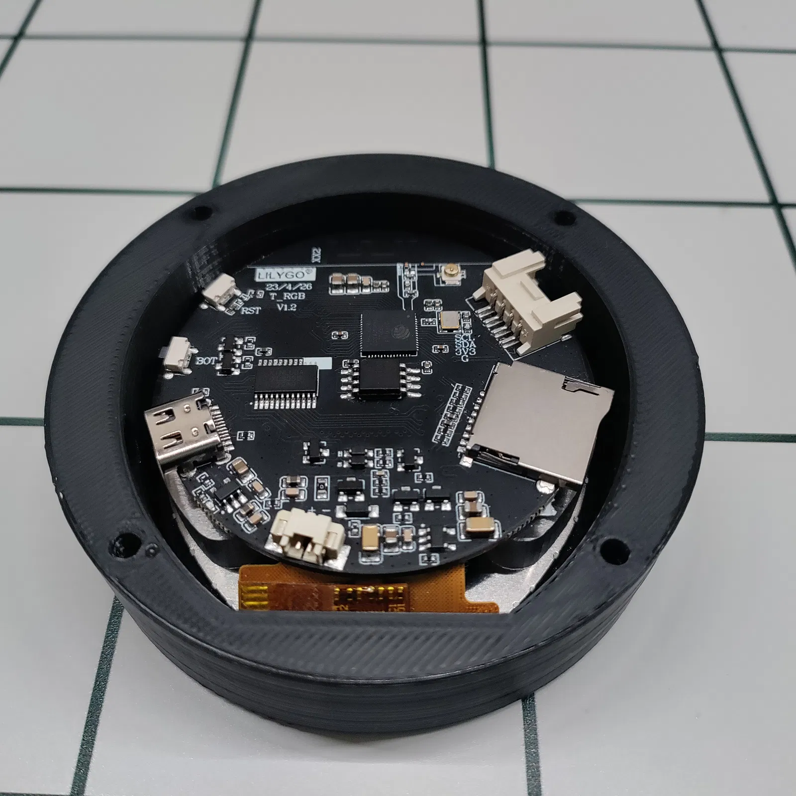 Vỏ cho bo mạch phát triển màn hình cảm ứng tròn LILYGO T-RGB. Có khoét lỗ cho cổng USB và thẻ SD.