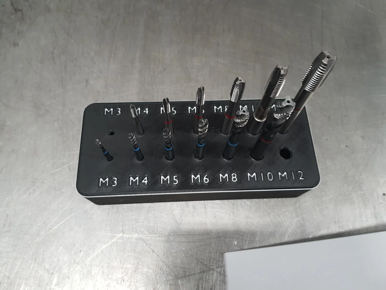 Chiếc kệ này được thiết kế để giữ các loại mũi taro mét từ M3 đến M12. Bạn có thể in bằng PLA, với các thông số đề xuất như đầu phun 0.4mm, lớp dày 0.3mm, và lưới 5% mật độ với 2 lớp viền để có sản phẩm tốt nhất.