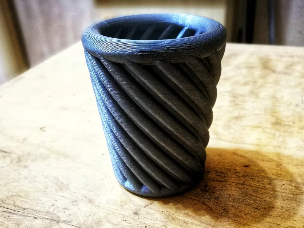 Cốc Barbara, được làm từ 16 thanh xoắn. Nó rất chắc chắn và phù hợp để đựng đồ dùng nhà bếp hoặc dụng cụ nhỏ. Tệp OpenSCAD đi kèm cho phép tùy chỉnh dễ dàng.