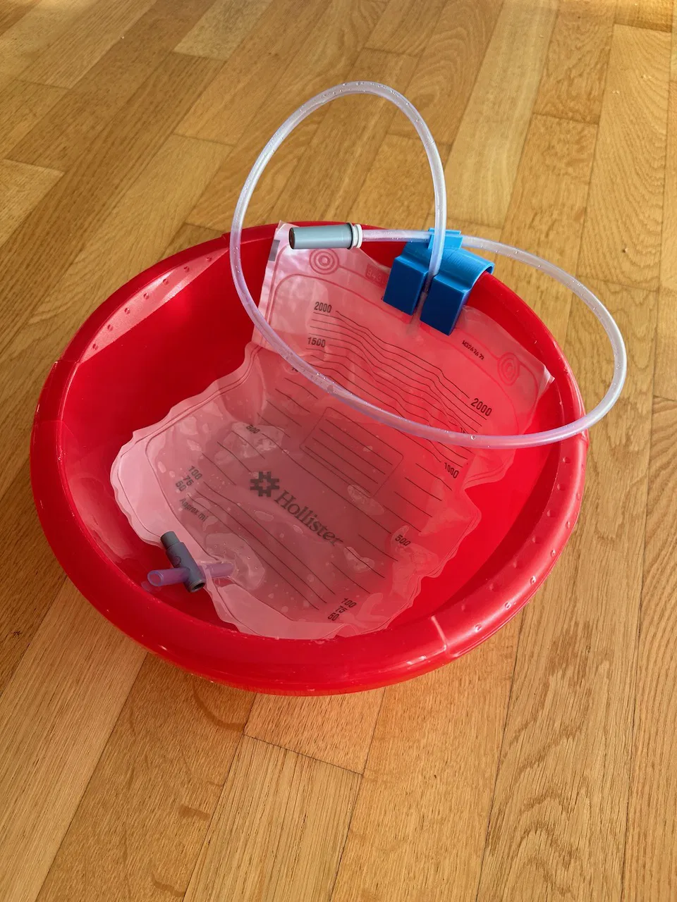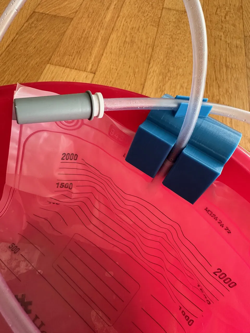 Kẹp cố định túi đựng nước tiểu qua đêm với giá đỡ gắn vào vật chứa, ví dụ như tô nhựa. Giúp ngăn túi bị xoắn và đảm bảo dòng chảy thông suốt, đồng thời giữ cho đầu ống hướng vào trong để tránh nhỏ giọt.