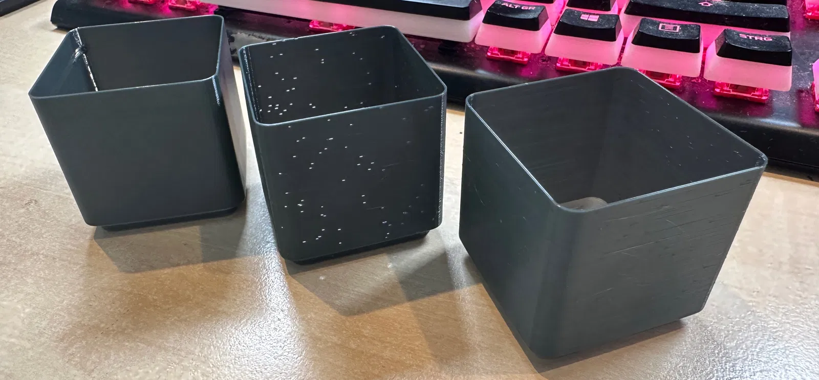 The one in the middle was created by setting the seam mode to “random”. It has holes like a piece of swiss cheese, but it's functional for holding nuts and bolts and to be honest: The hole pattern is quite pretty. Still, I wanted to get rid of the holes.