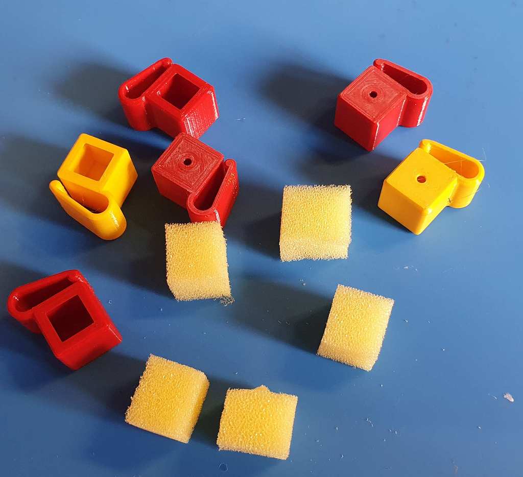Giá đỡ filament của tôi có 2 chức năng cùng lúc: Nó cố định filament vào cuộn dây và nhờ miếng mút bên trong, nó giữ và (vì nó vẫn dính vào filament trong quá trình in) làm sạch filament khỏi bụi bẩn, v.v.