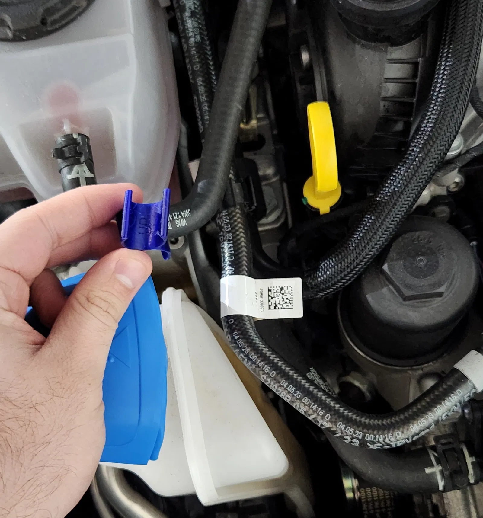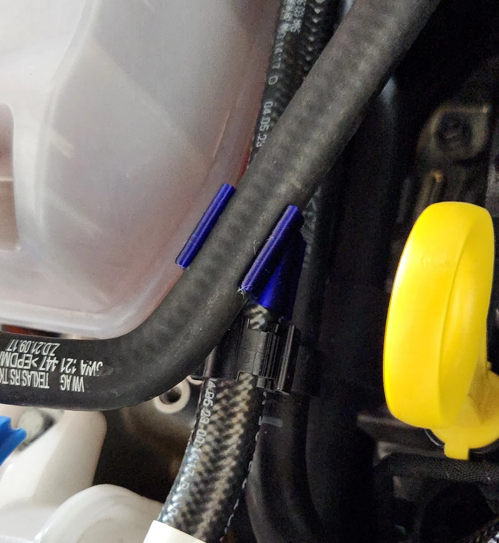 Cái kẹp ống xăng thì lớn hơn cái kẹp ống nước làm mát 0.1 mm. Tôi đã đánh dấu bên trong kẹp lên và xuống để phân biệt chúng. Mặt xuống là ống xăng. Mặt lên là ống nước làm mát.