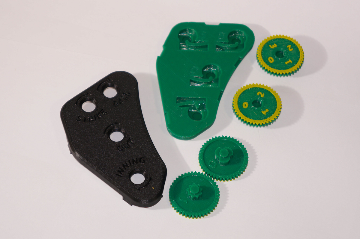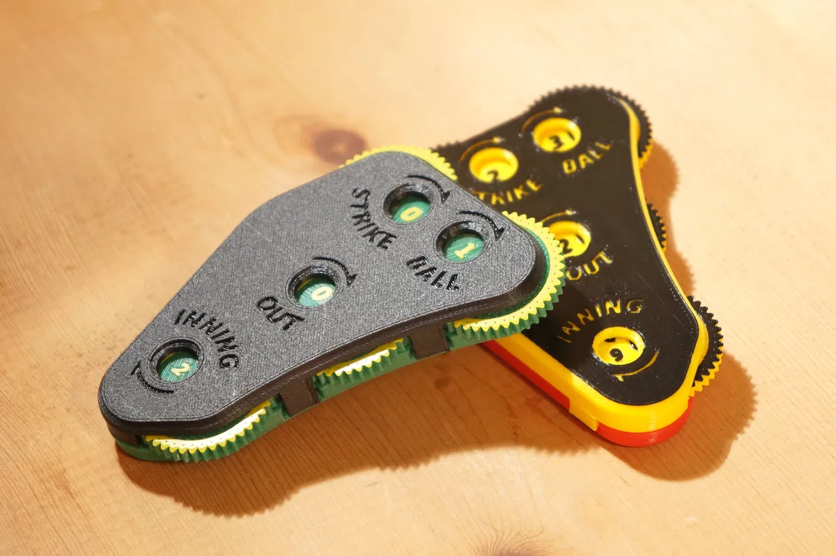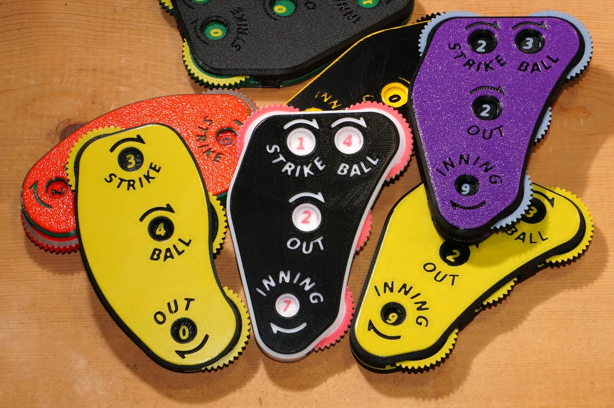 Những chiếc đồng hồ này có mặt số theo thứ tự truyền thống là: strike, ball, out, inning. Nếu bạn thích kiểu "thứ tự đếm", bạn có thể tìm thấy ở đây. Có hai lựa chọn đồng hồ: loại bốn mặt số đếm strike, ball, out và inning, và loại nhỏ hơn ba mặt số đếm strike, ball và out. Mỗi số trên mỗi mặt số được căn chỉnh chính xác bằng lò xo tích hợp. Xoay mặt số cho đến khi bạn cảm thấy nó khớp vào số tiếp theo. In các bộ phận bạn muốn và lắp chúng lại với nhau, không cần thêm phần cứng.