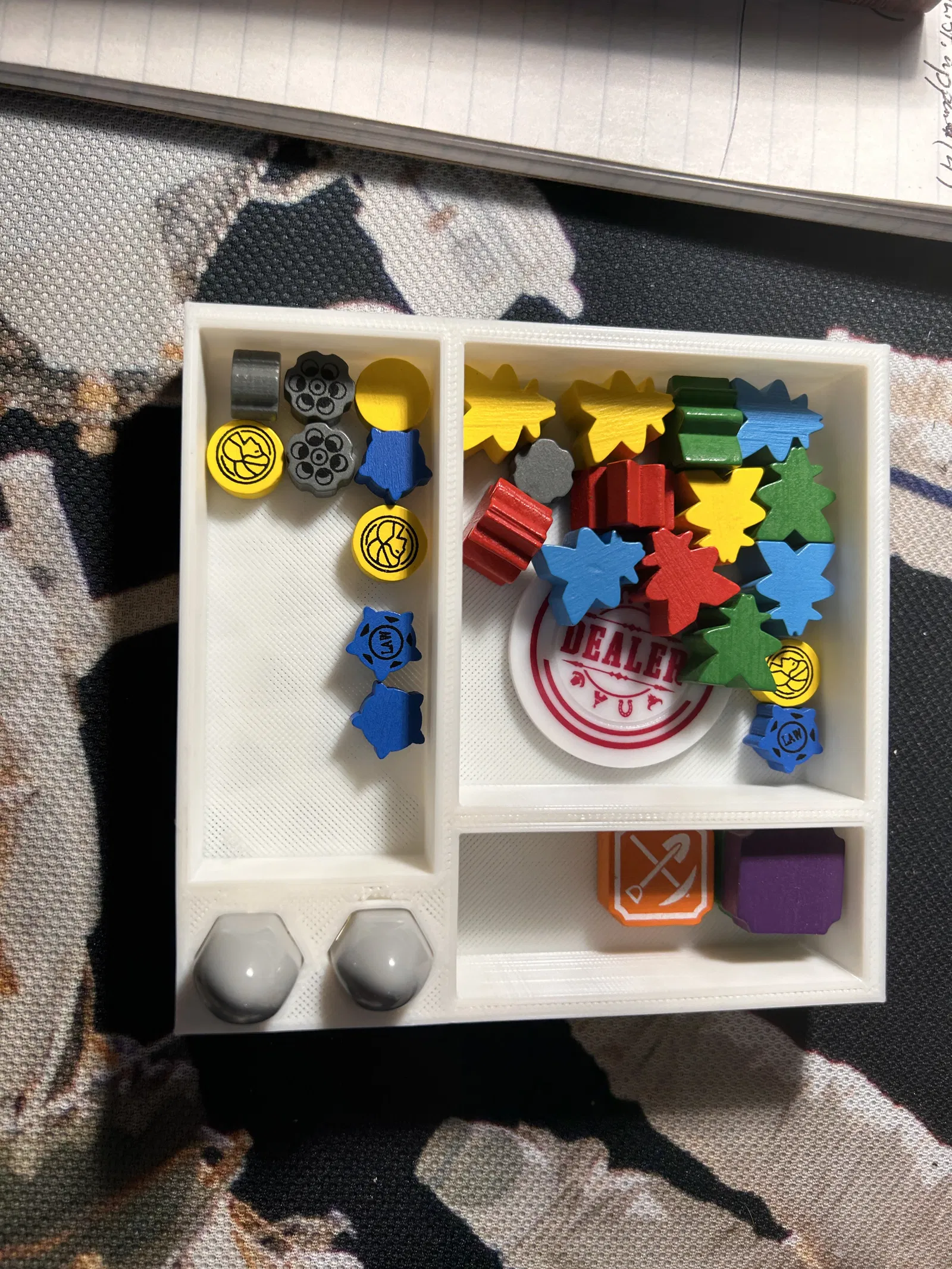 Hộp đựng giúp sắp xếp gọn gàng cho board game Tiny Epic Western, có đủ không gian cho mọi thứ trong hộp, kể cả tài liệu giấy đi kèm. In bằng PLA với infill 20% trên Ender 3 Neo.