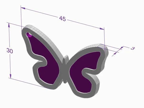 Móc khóa hình bướm với kích thước chính là 3mm (độ dày) x 30mm (chiều cao) x 45mm (chiều rộng).