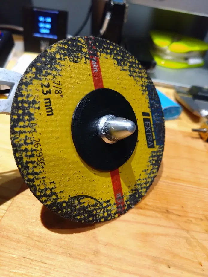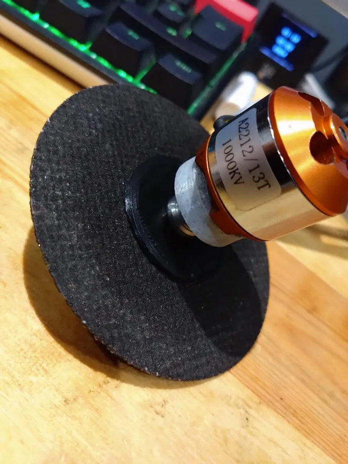 Giá đỡ đĩa mài cho trục 4mm dùng để gắn đĩa mài góc vào động cơ không chổi than cho robot chiến đấu. In bằng PETG @ chiều cao lớp 1.2mm, 100% mật độ. cid:image_1