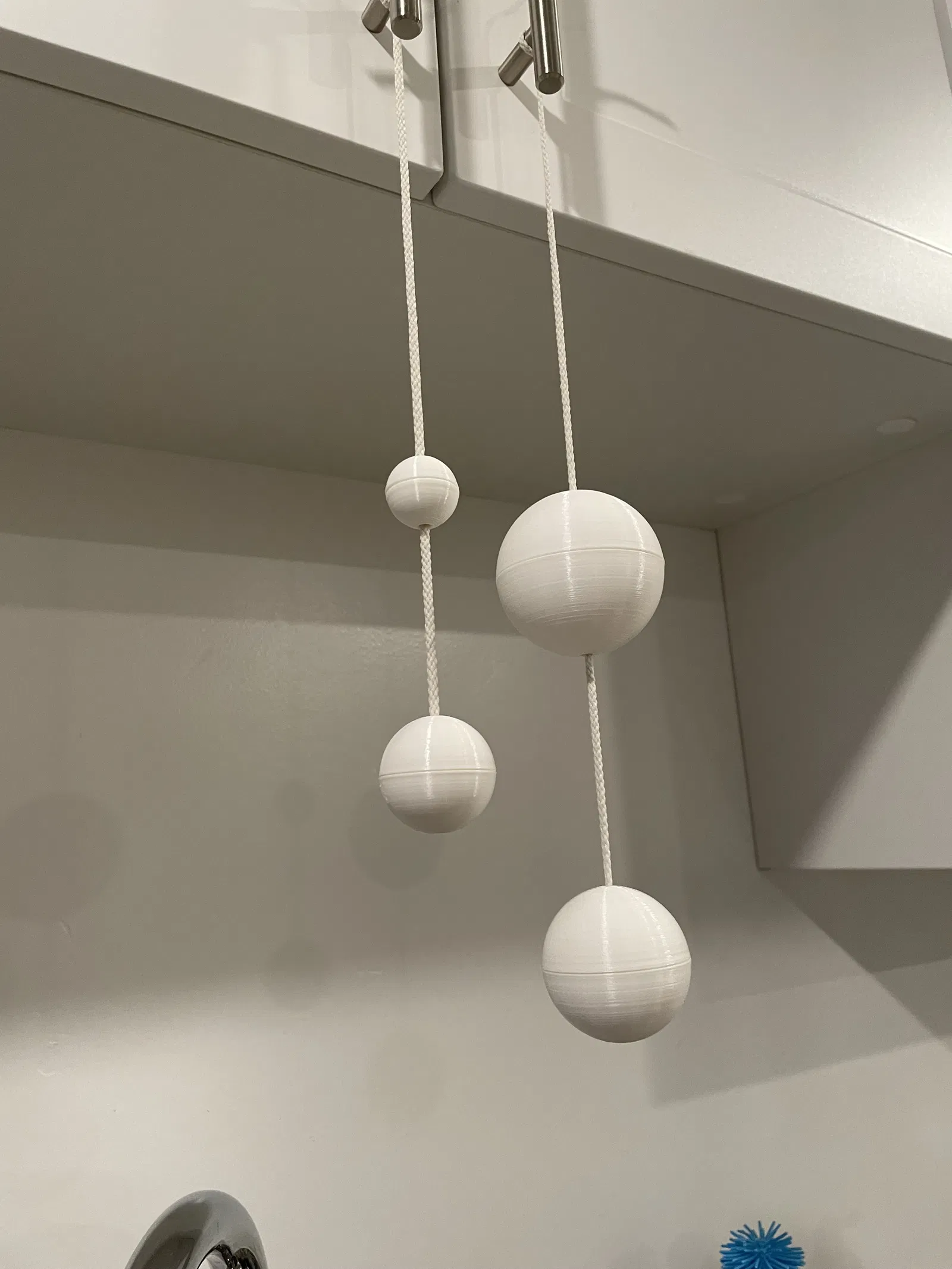 Mỗi quả bóng được làm từ 3 phần, 2 nửa hình cầu và thanh ren nối chúng. Chúng cũng có một lỗ ở mỗi nửa cho phép luồn dây hoặc sợi qua. Lỗ này sẽ phải được khoan sau khi in. Các lỗ trong mỗi quả cầu có đường kính 3/16"