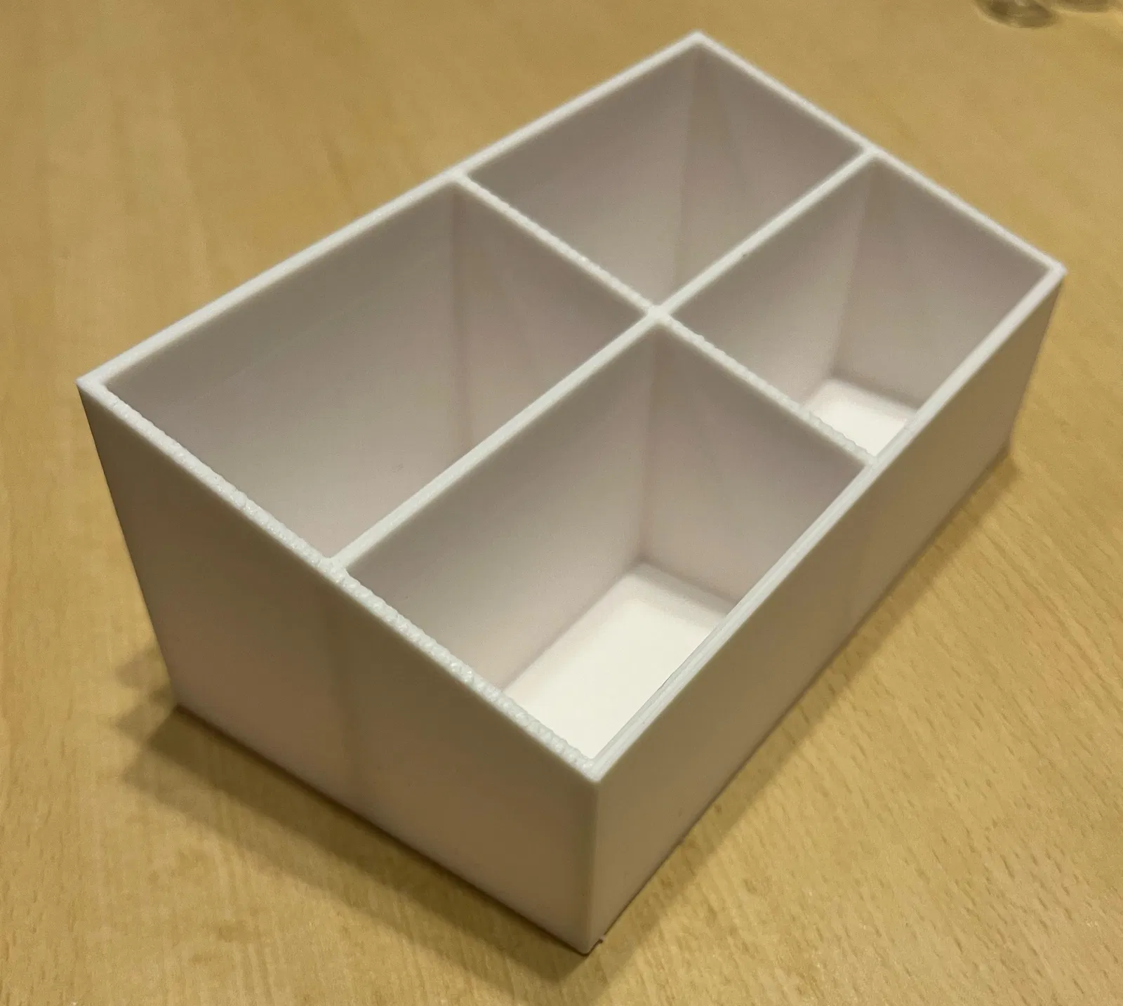 Hộp nhỏ để sắp xếp các nguyên liệu làm bánh như bột nở, đường vani,... trong bếp. Có 4 ngăn, in bằng PLA hoặc PETG với độ dày lớp 0.20 - 0.28 mm.