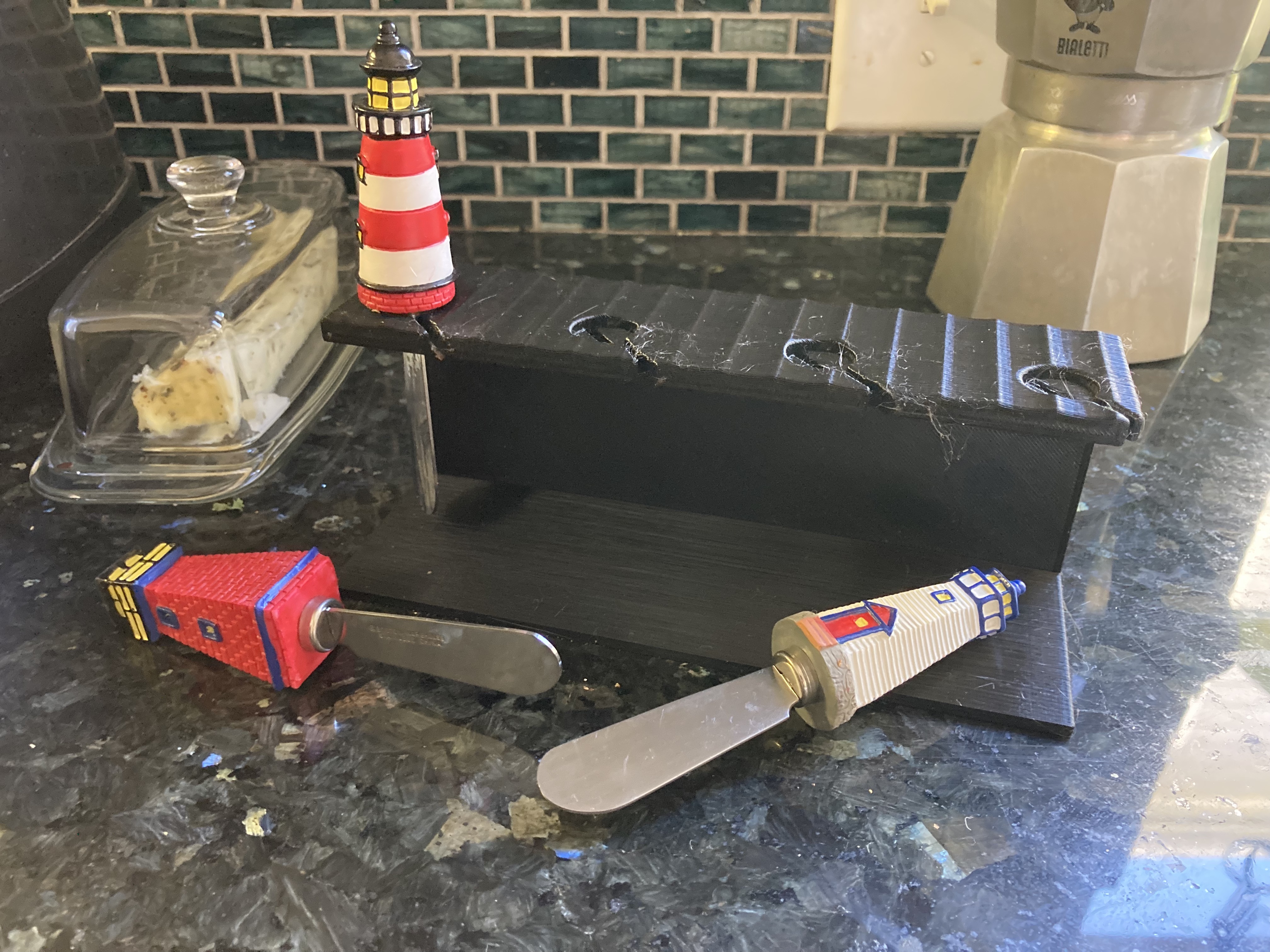 Một chiếc đế đựng độc đáo được thiết kế riêng cho bộ dao bơ hình ngọn hải đăng của Boston Warehouse SPREADERS. Giúp bạn cất giữ dao gọn gàng, tiện lợi, tránh phải rửa sau mỗi lần sử dụng. Rất hữu ích nếu bạn cũng sở hữu bộ dao này!