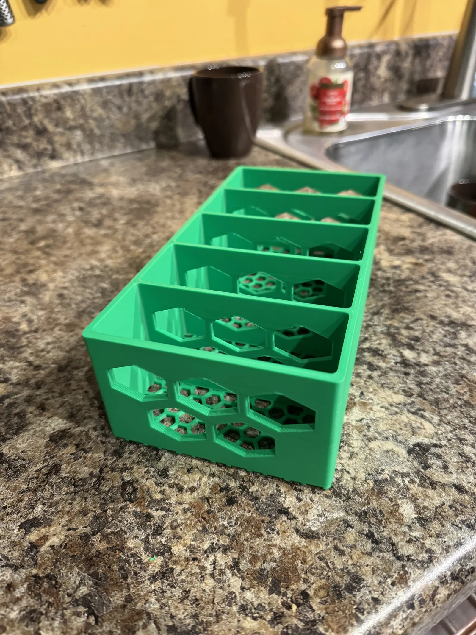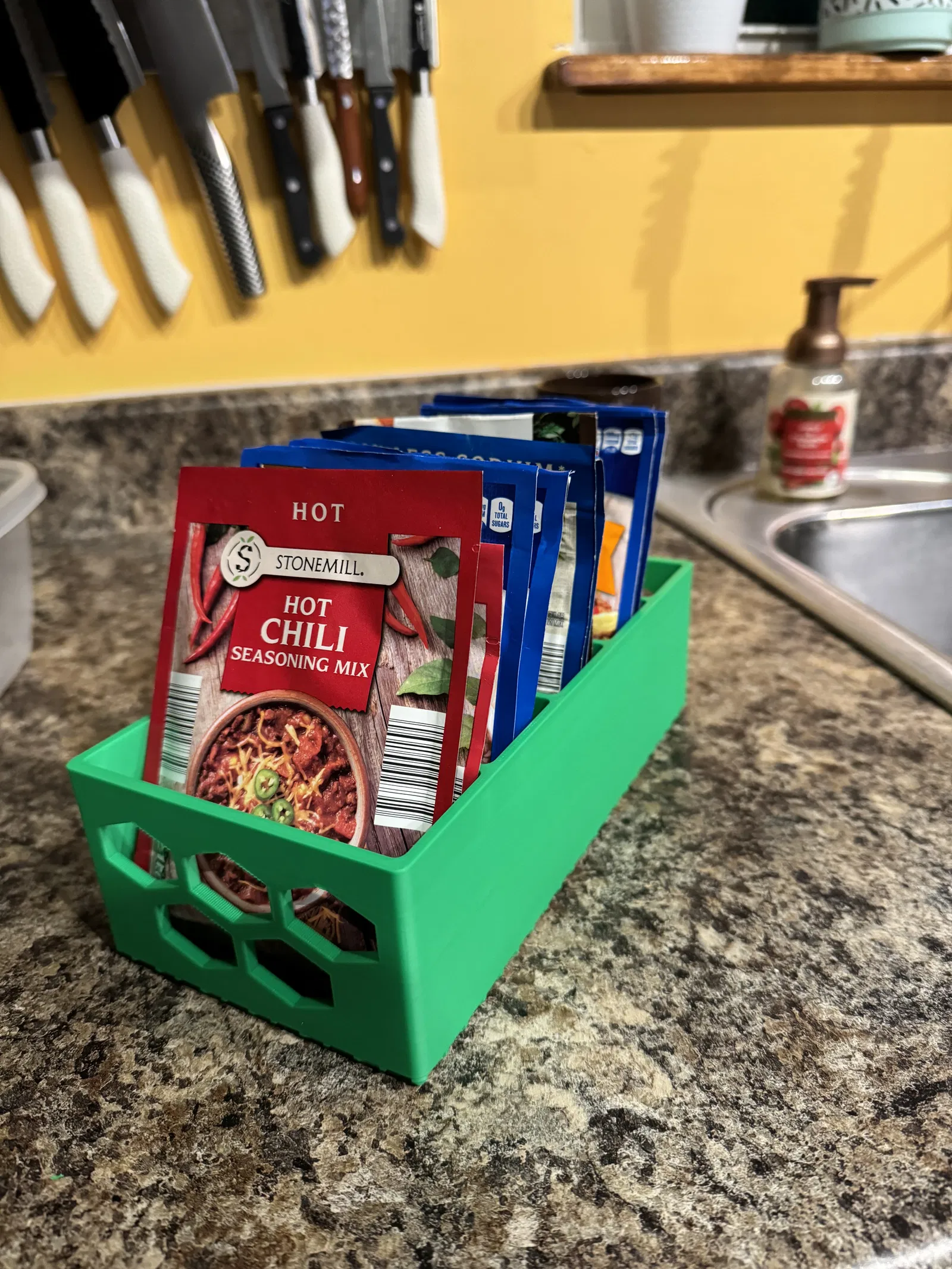 Phóng to file đựng gia vị để vừa với các gói sốt gravy, ớt và taco tiêu chuẩn. Sản phẩm này giúp bạn sắp xếp các gói gia vị một cách gọn gàng, tiết kiệm không gian bếp.