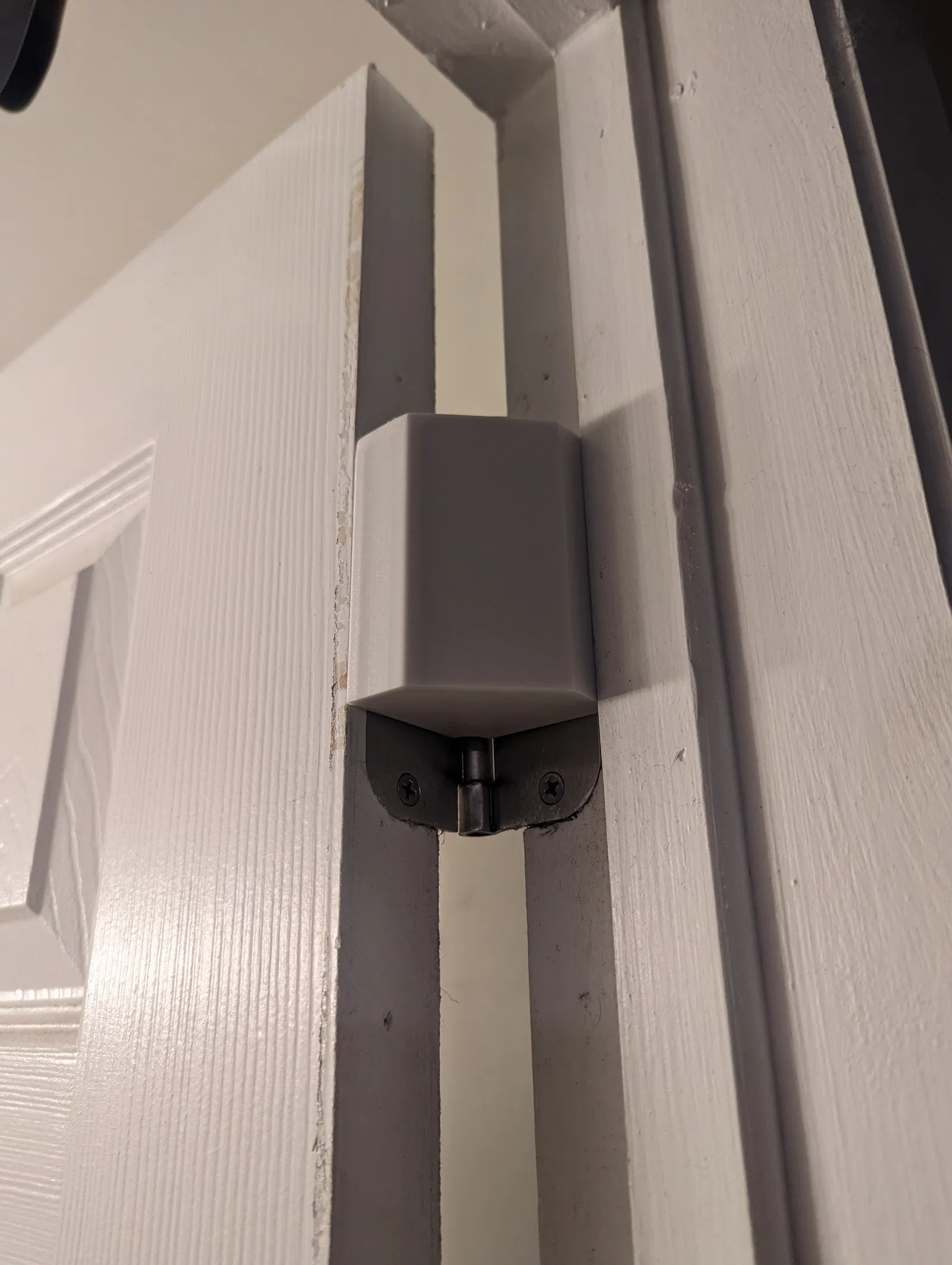 Cái chặn cửa này được thiết kế để đủ cứng cáp, chống lại sức mạnh của một đứa trẻ đang quậy phá. Chế tạo cho bản lề cửa 15mm, có thể cần chỉnh scale nếu bạn dùng bản lề khác. In nhanh với PLA chỉ 2.5 tiếng.