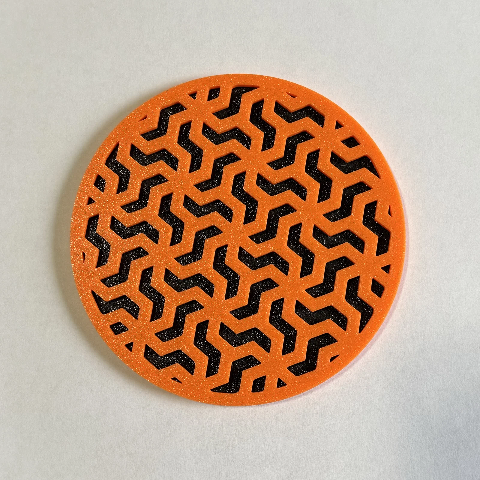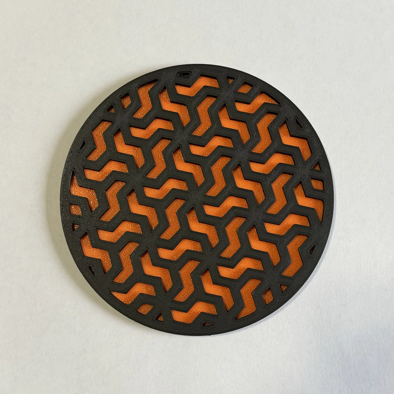 Tui thấy mấy cái đế lót ly bằng gỗ trên mạng nên tui quyết định làm phiên bản in 3D cho nó. Mấy cái đế lót ly này có đường kính 115mm, được chia làm hai phần để phần trên và phần dưới có thể in bằng hai màu khác nhau mà không cần máy in đa vật liệu. Bạn cứ dùng vật liệu và cài đặt in nào bạn thích, nhưng tui khuyên bạn nên in úp mặt trên xuống khay in có bề mặt nhám để có lớp hoàn thiện đẹp.