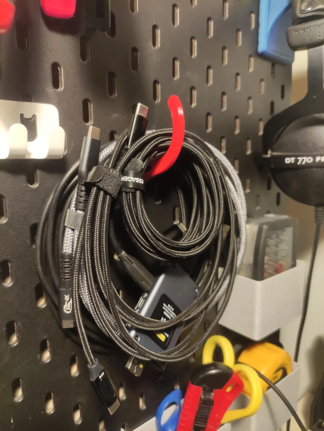 Móc Skadis giúp bạn giữ dây cáp gọn gàng. Mẫu in nhanh, dễ dàng, được thiết kế để vừa vặn và không bị rơi ra. Tối ưu hóa cho việc in ấn với cài đặt đề xuất và khả năng tùy chỉnh.