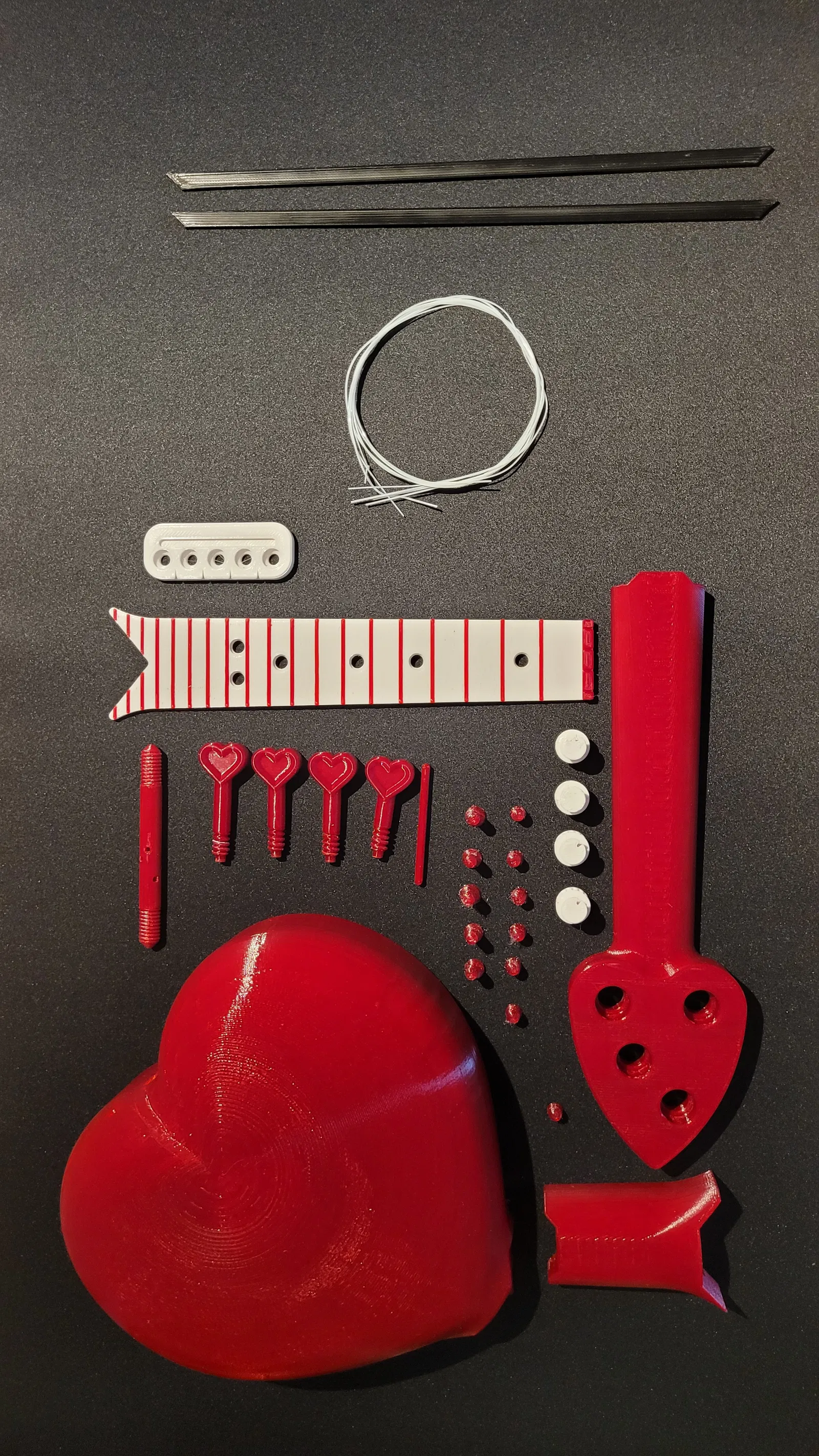 - Không cần thêm bộ phận nào (Chỉ cần dây đàn là đủ (không cần khóa đàn, ngựa đàn, ốc vít, đai ốc, v.v.), tất cả đều in 3D (bạn có thể thêm các thanh carbon fiber nhưng đó là tùy chọn)