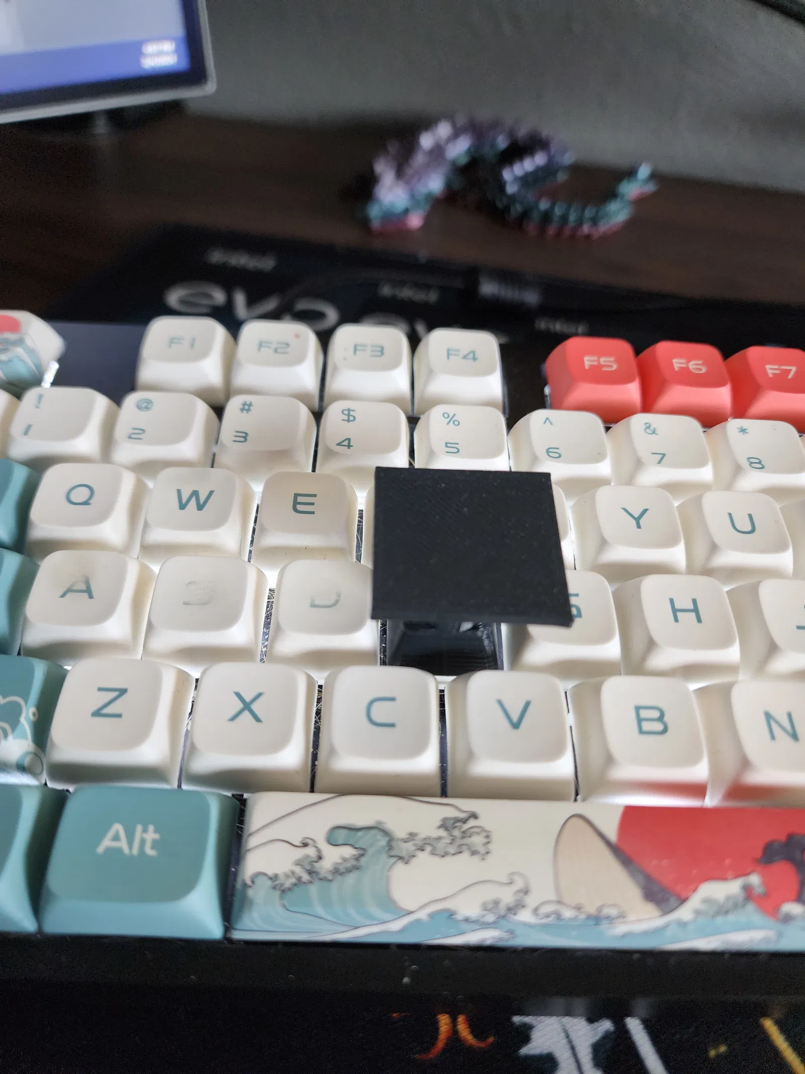 Đây là một keycap được thiết kế để bạn có thể đặt một vật phẩm lên phím F, giúp phím có đế rộng hơn để giữ vật phẩm. Phím F này được nâng cao với một bệ để bạn đặt đồ vật lên, làm cho nó nặng hơn.