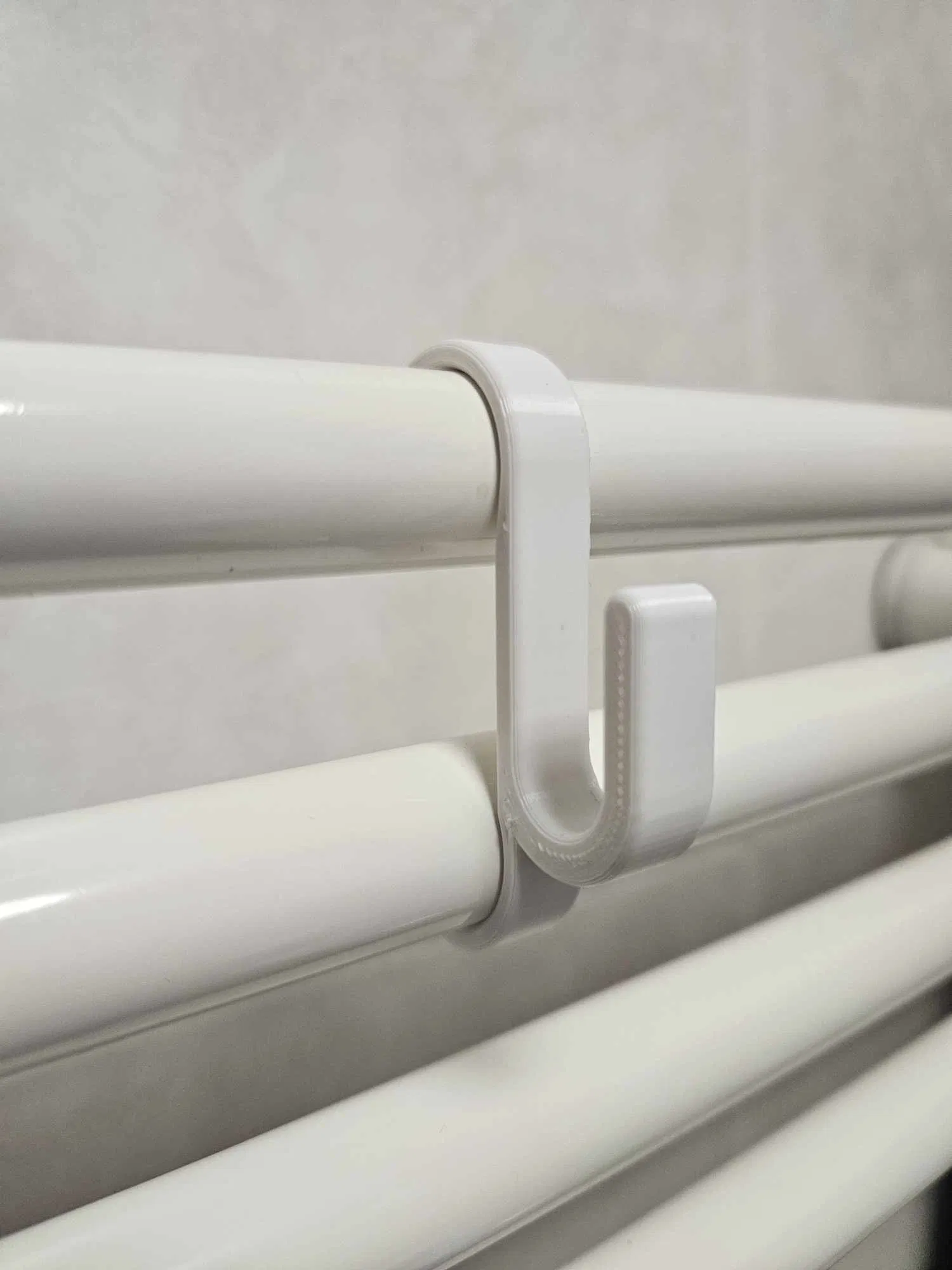Móc treo khăn đơn giản mà hữu ích cho dàn nóng phòng tắm. Nhớ đo kích thước dàn nóng nhà bạn trước khi in để đảm bảo móc vừa khít nha!
