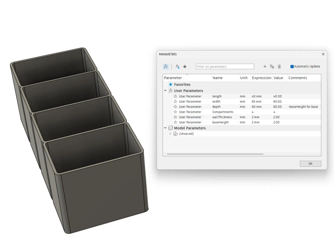 Cảm ơn bạn đã tải xuống mô hình Khay chia gói gia vị nhà bếp! Mô hình này có thể tùy chỉnh bằng Fusion 360, giúp bạn dễ dàng điều chỉnh kích thước cho phù hợp với nhu cầu. Hướng dẫn chi tiết cách chỉnh sửa thông số và cài đặt in cơ bản được cung cấp kèm theo hình ảnh minh họa. Chúc bạn in vui vẻ!
