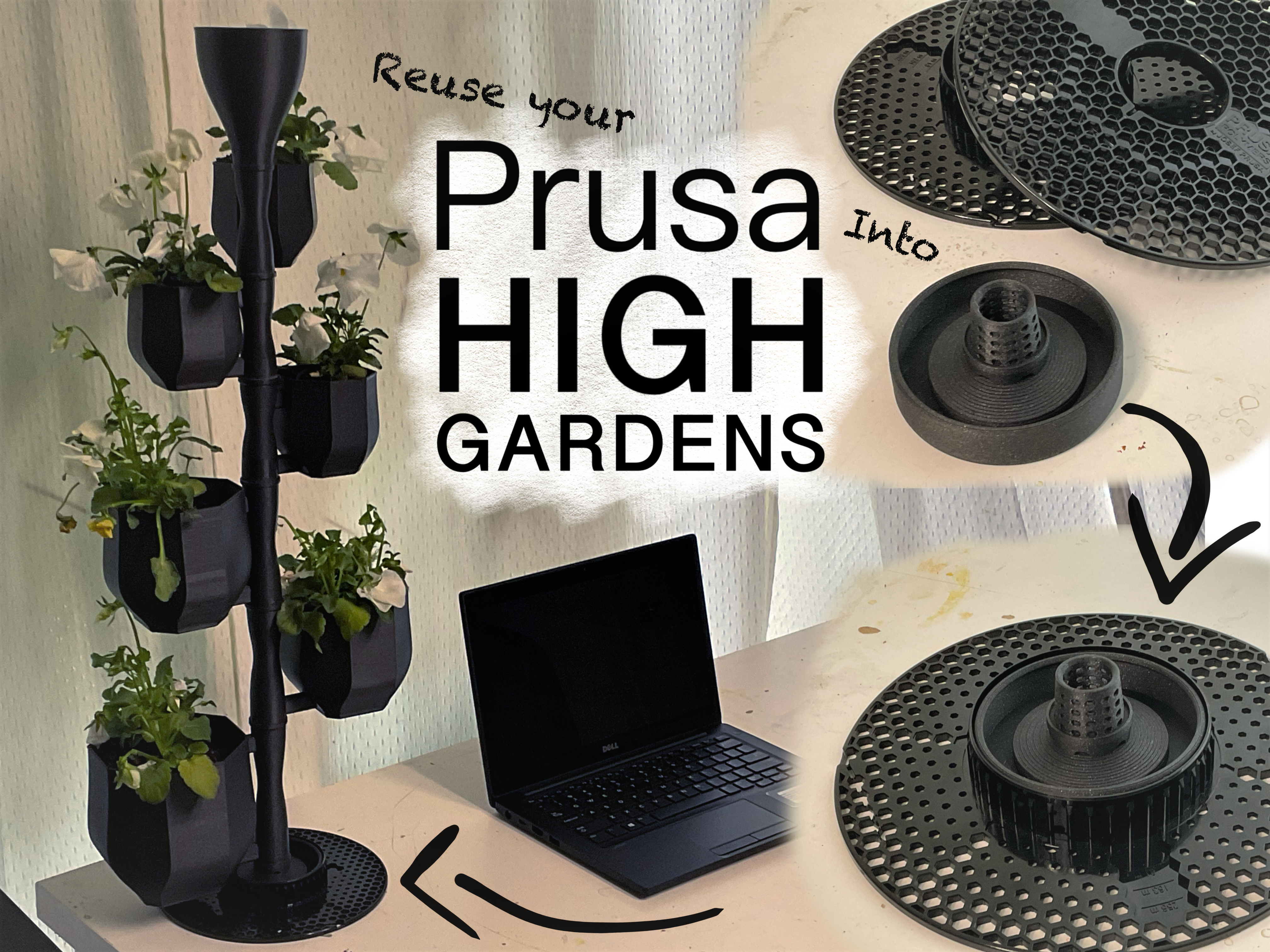 High Gardens mục đích là để trồng thêm cây trong không gian sống (trống) của bạn. Một tháp vườn tự cân bằng với các chậu cây được phân bố xung quanh để phân tán trọng lượng. Được thiết kế cho những cây thích chu kỳ ướt và khô rõ ràng. Cũng dễ dàng để tưới nước, nước thừa từ cây này chảy xuống cây tiếp theo và giảm thiểu các đĩa hứng nước. Hệ thống đã được in và thử nghiệm, tháp cây vẫn thẳng và vững chắc nhờ khớp nối hình nón.