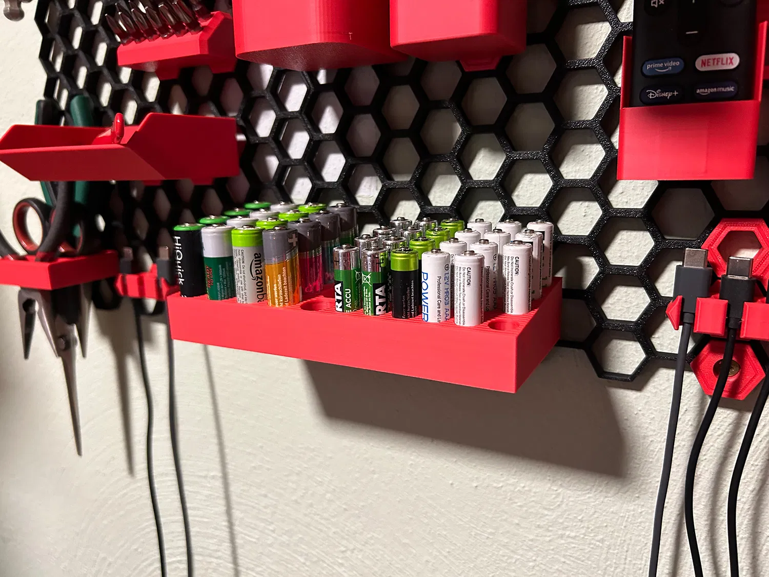 Giá đỡ pin cho hệ thống tường lưu trữ tổ ong (honeycomb storage wall). Có thể chứa 20 pin AA hoặc 24 pin AAA. In bằng PLA, không cần supports.