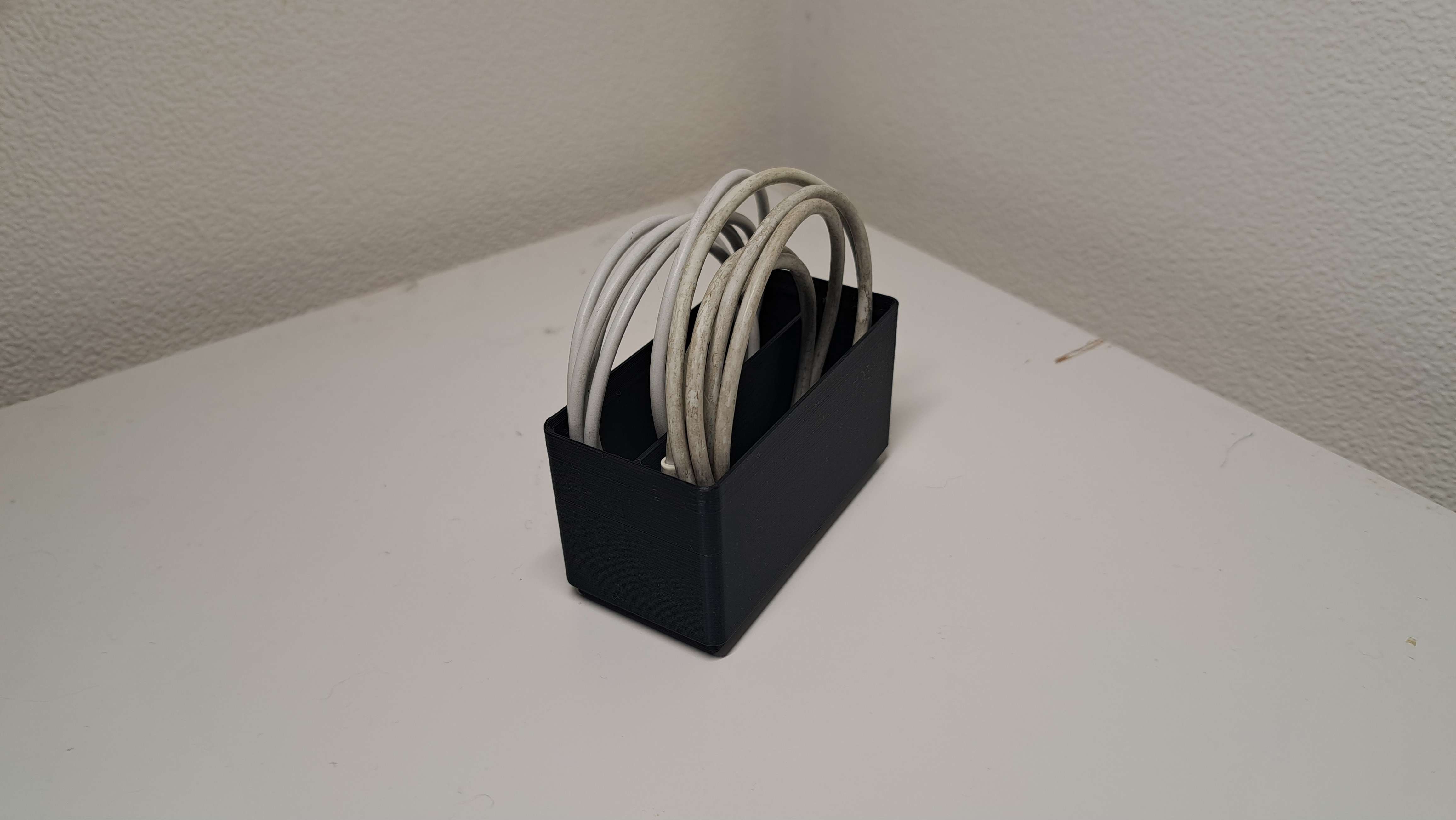 Không tìm được chỗ giữ chỉ 2 sợi cáp nên tui tự chế cái này cho gọn. Chứa được 2 sợi cáp, có lỗ gắn nam châm nhưng tui chưa có làm đâu nha. In nhanh lắm, chưa tới 1h30 là xong!