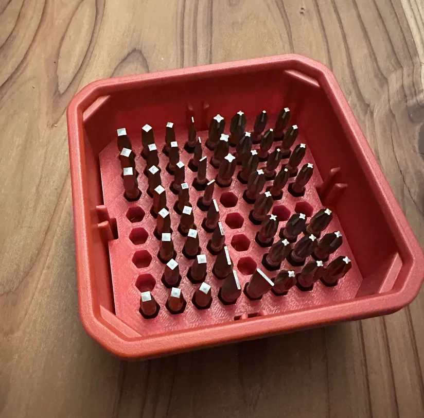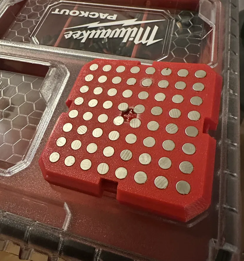 Khuôn giữ mũi khoan nam châm dành cho hộp đựng Milwaukee Packout Slim nhỏ gọn. Dùng nam châm 6x2mm và keo siêu dính để gắn. In bằng PETG, không cần hỗ trợ. File STEP có sẵn.