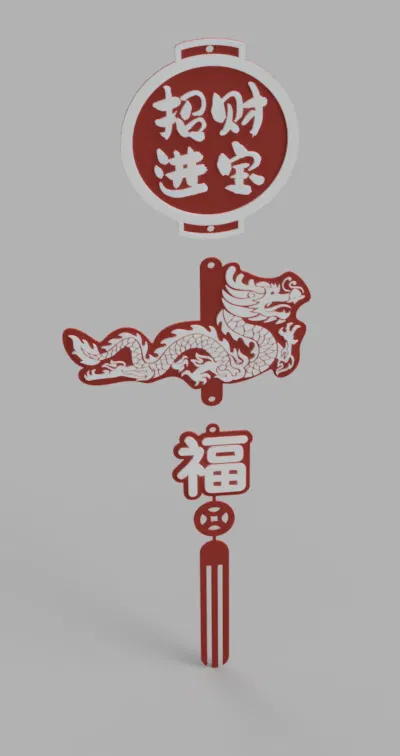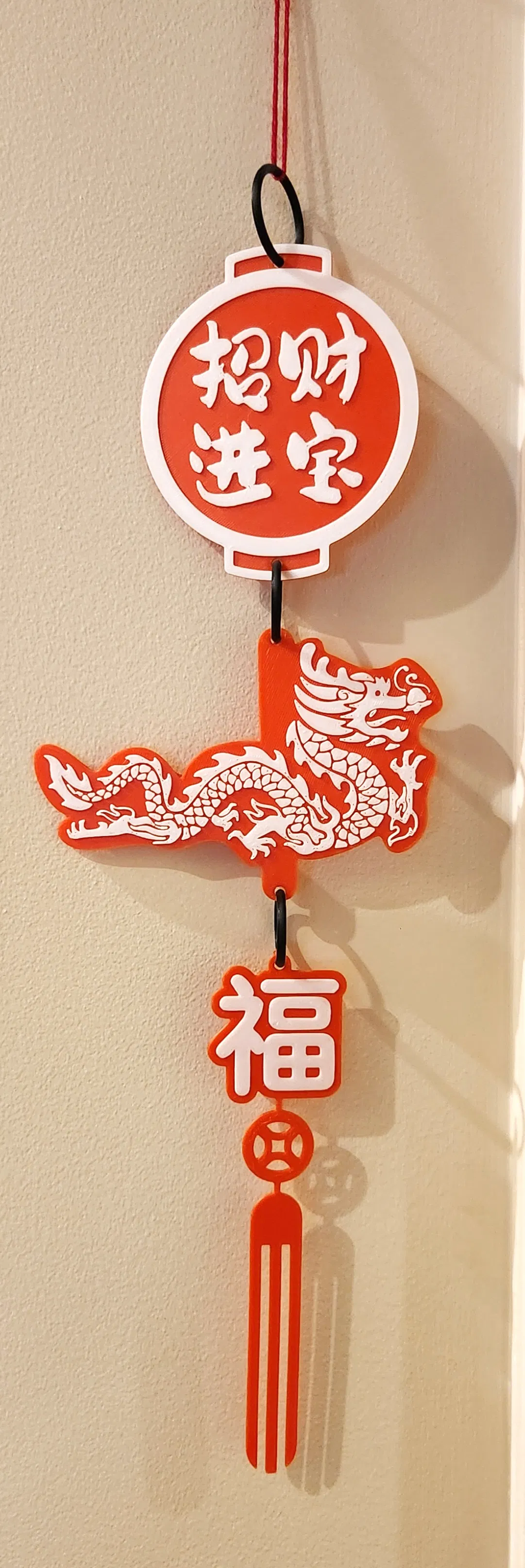 Có ba mảnh riêng biệt và các lỗ liên kết thì cân bằng (đủ dùng). Tôi đã in mảnh đầu tiên màu đỏ 1.4mm và sử dụng macro thay đổi lớp để chuyển sang màu trắng cho phần chữ và con rồng. Việc thay đổi màu sắc không được bao gồm trong tệp 3MF vì tôi nhận thấy các slicer khác nhau xử lý nó khác nhau. Tôi đã tạo một vòng tròn, cắt nó ra, và dùng súng bắn keo 3D để hàn chúng lại với nhau để các vòng tròn giữ các mảnh lại với nhau. (Các lỗ có đường kính 4mm). Một lựa chọn khác là dùng sợi len, chỉ, dây thừng, hoặc dây kẽm. Hoặc, cũng có vô số các vòng in 3D có sẵn. Tôi đã đính kèm của mình ở đây, mặc dù tôi khuyên bạn nên dùng keo hoặc hàn chúng để giữ cho ổn định.