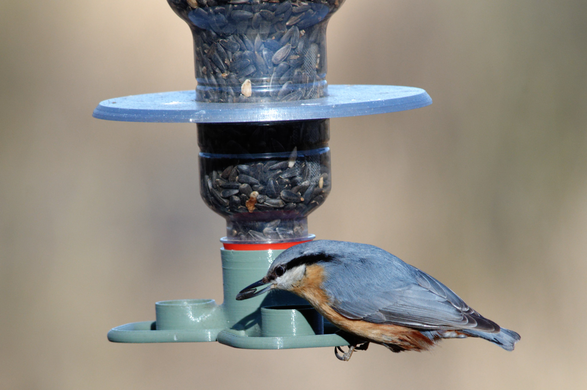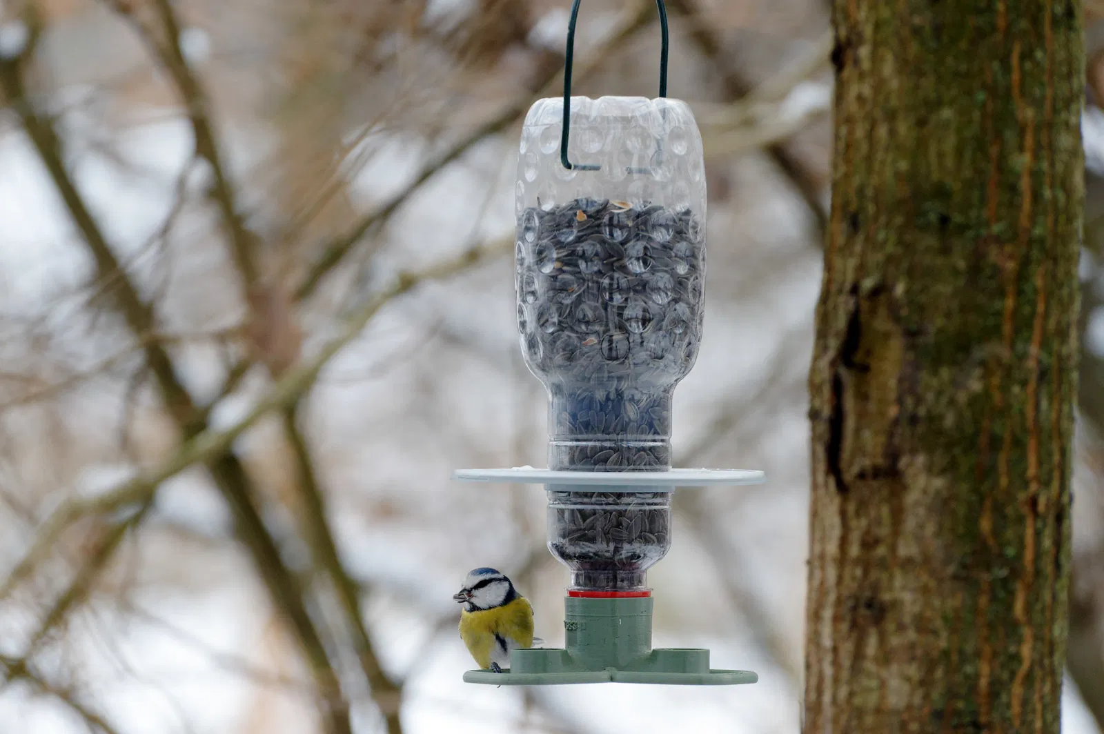 Khay đựng thức ăn cho chim tự động với bộ phân phối từ chai PET, bao gồm cả mái che. Sử dụng chai PET đựng sữa, nước ép hoặc bất kỳ loại nào có ren 38mm tiêu chuẩn. Có mái che điều chỉnh độ cao. Ưu điểm: nạp nhiều thức ăn, dễ di chuyển, vệ sinh. Chất liệu PET-G, PLA bền bỉ qua nhiều mùa. In dễ dàng không cần hỗ trợ.