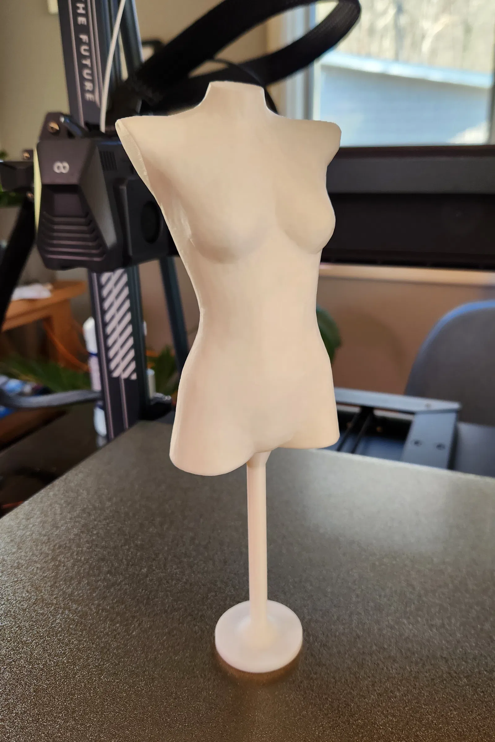 Phần thân manocanh ban đầu được làm bằng MakeHuman rồi chỉnh sửa lại cho vừa kích cỡ. Khi đặt lên đế, tổng chiều cao khoảng 235mm. Cái hay là in khá nhanh, tốn chưa tới 2 tiếng cho cả đế và manocanh. Phần đế thì in riêng và có ren để giảm (đáng kể) nhu cầu dùng support.
