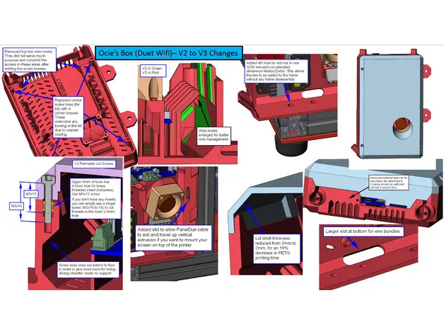 - Duet Enclosure V3 220: Có thể in trên bàn 220mm. Các khe cắm đầu nối Wago, cũng như các lỗ vít cho bo mạch USB thứ hai và mosfet đã bị loại bỏ. Thiết kế này giữ nguyên tất cả các tính năng bên ngoài giống nhau, tất cả các tính năng Duet, quạt làm mát và một bo mạch nguồn USB. Xem hình ảnh "Ocie's Box V3 220 edition.jpg" để biết cái nhìn tổng quan về lắp ráp.
