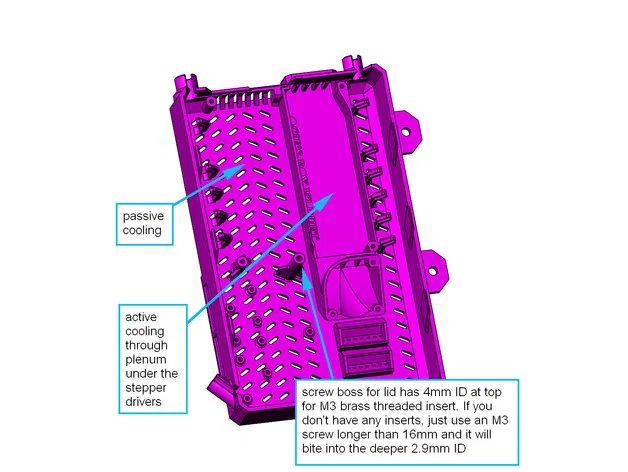 - Duet Enclosure V3 200: Có thể in trên bàn 200mm. Phiên bản này có cùng bộ tính năng với phiên bản 220, nhưng khoảng trống giữa cạnh dưới của quạt và cạnh dưới của hộp hơi chật. Điều này sẽ làm cho việc đi dây hơi rối hơn, vì một số dây chắc chắn sẽ cần đi qua Duet, mà đây là một trong những điều tôi cố tình thiết kế vỏ ban đầu để tránh. Nhưng thực tế, không có vấn đề gì khi có dây ở phía trước Duet - đó hoàn toàn là thẩm mỹ. Việc làm mát được xử lý bởi quạt ở mặt sau của bo mạch, vì vậy dây ở phía trước bo mạch sẽ không cản trở việc làm mát. Như mọi khi, các tệp STEP được cung cấp cùng với các tệp STL, để bạn thoải mái tùy chỉnh.