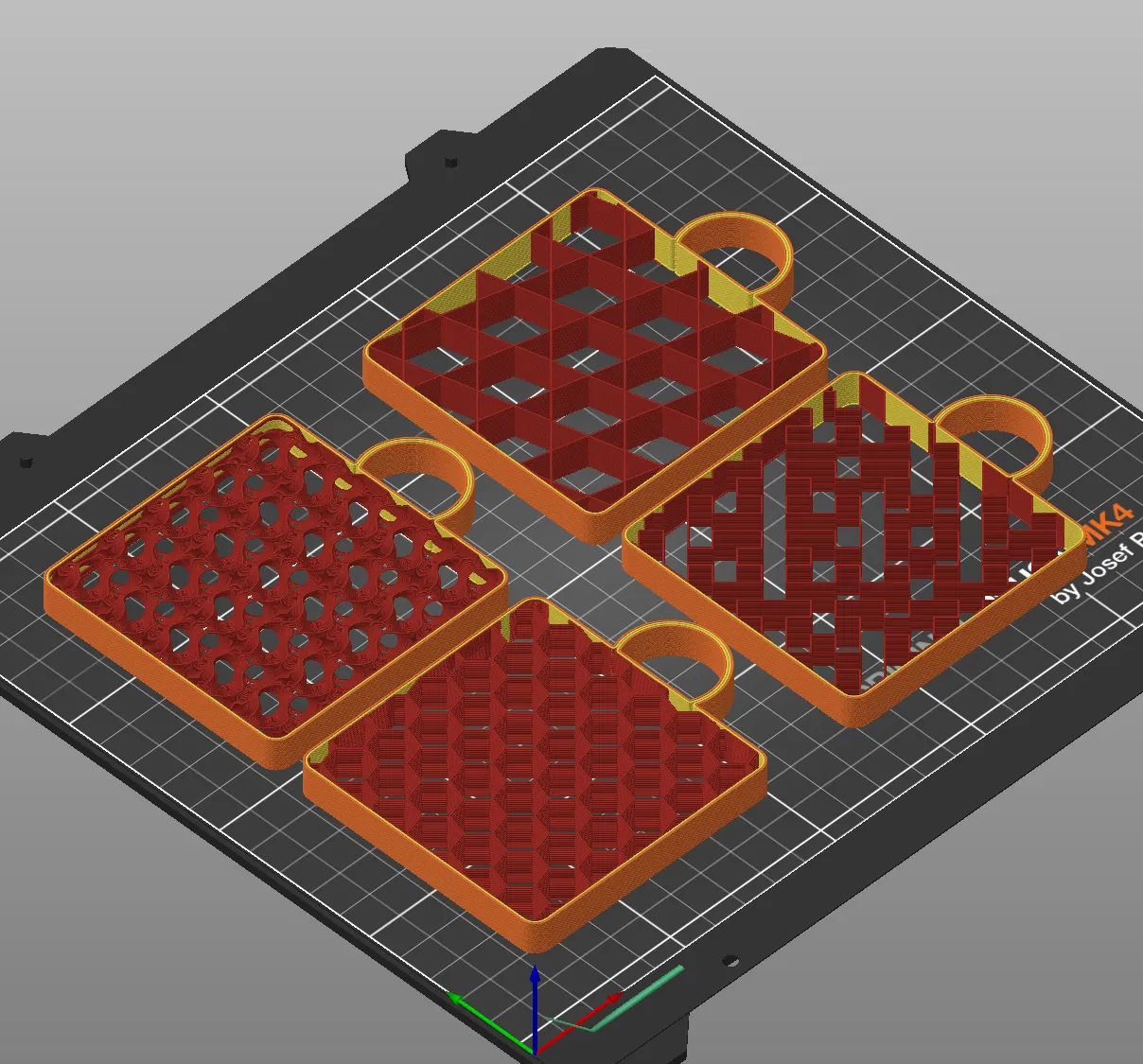 Một bộ sưu tập các mẫu gạch với phần ruột (infill) được hiển thị rõ ràng, cho phép bạn thấy ảnh hưởng của kiểu ruột lên các đặc tính cơ học và thẩm mỹ của bản in.