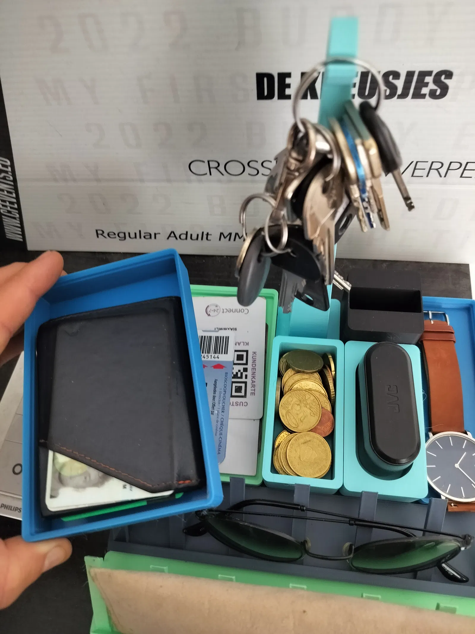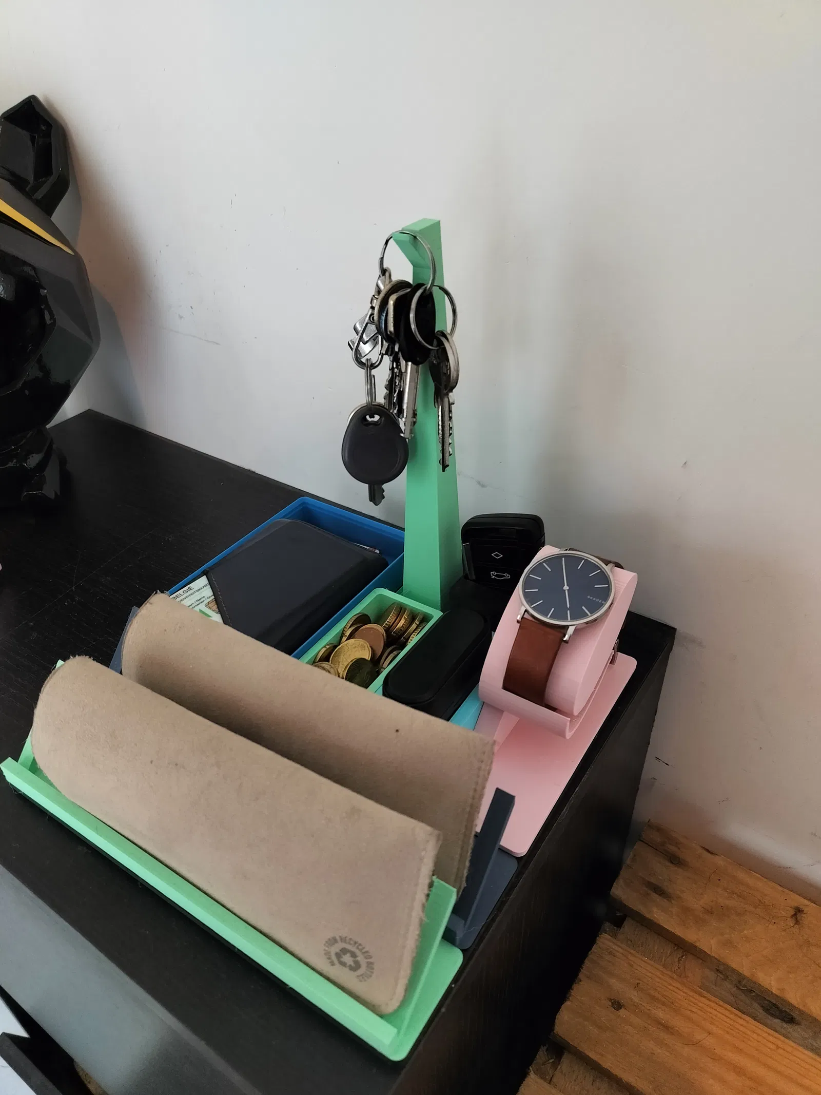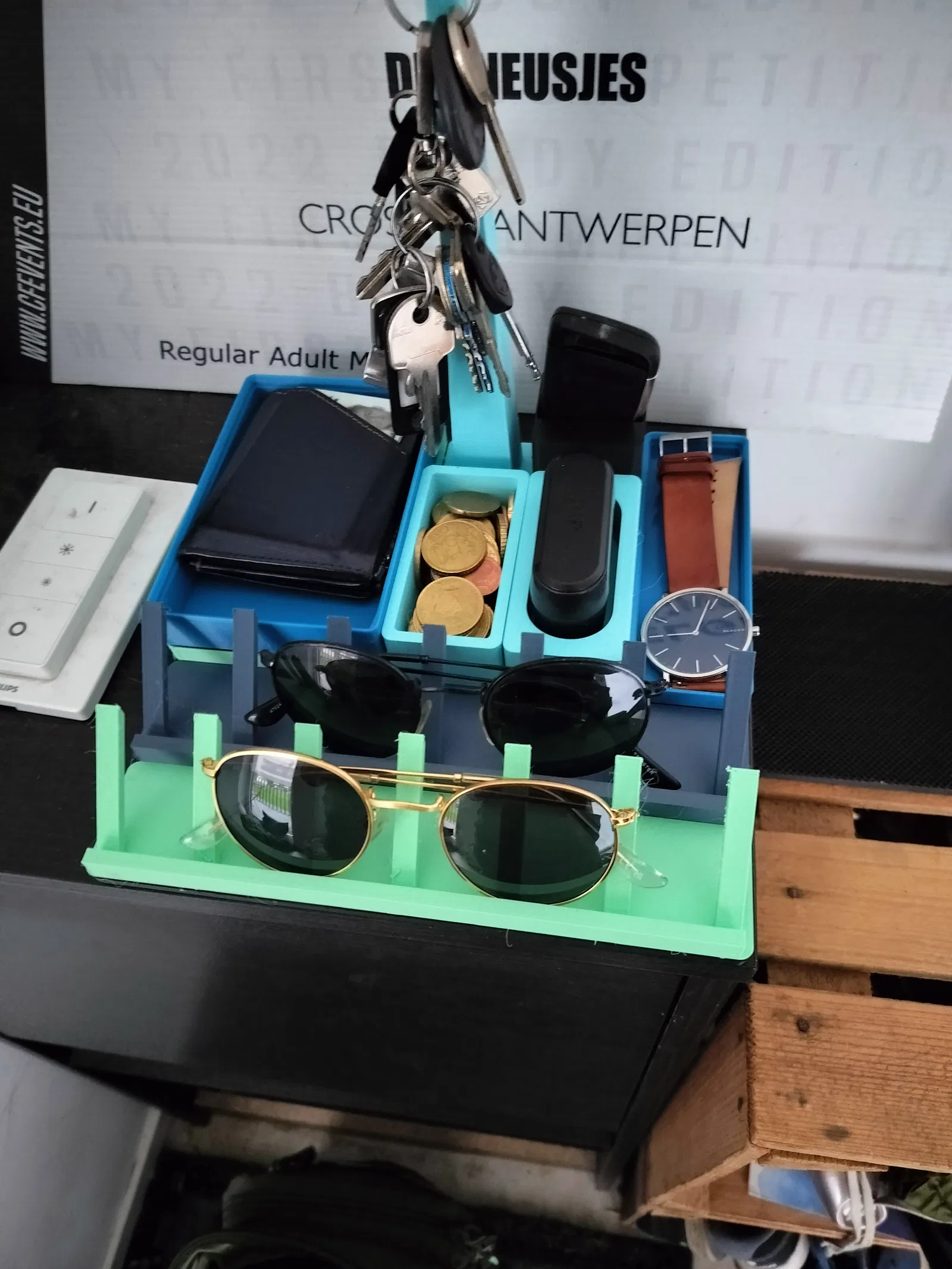 Cần một cái khay để sắp xếp sảnh ra vào nhà cho gọn gàng. Mẫu này dựa trên tiêu chuẩn Gridfinity, có chỗ để ví, chìa khóa xe, kính mát, tiền xu, tai nghe và viết. Rất tiện lợi để giữ mọi thứ ngăn nắp.