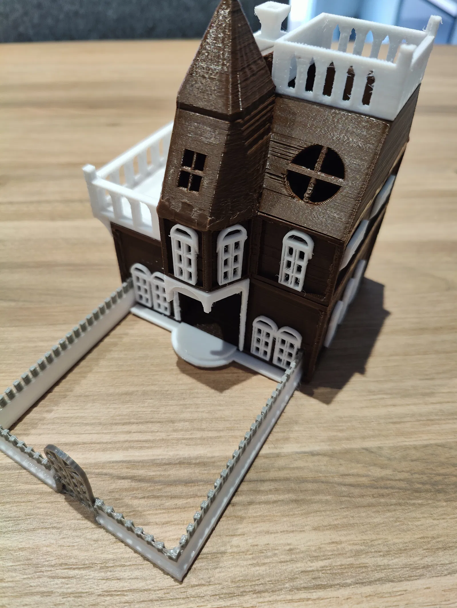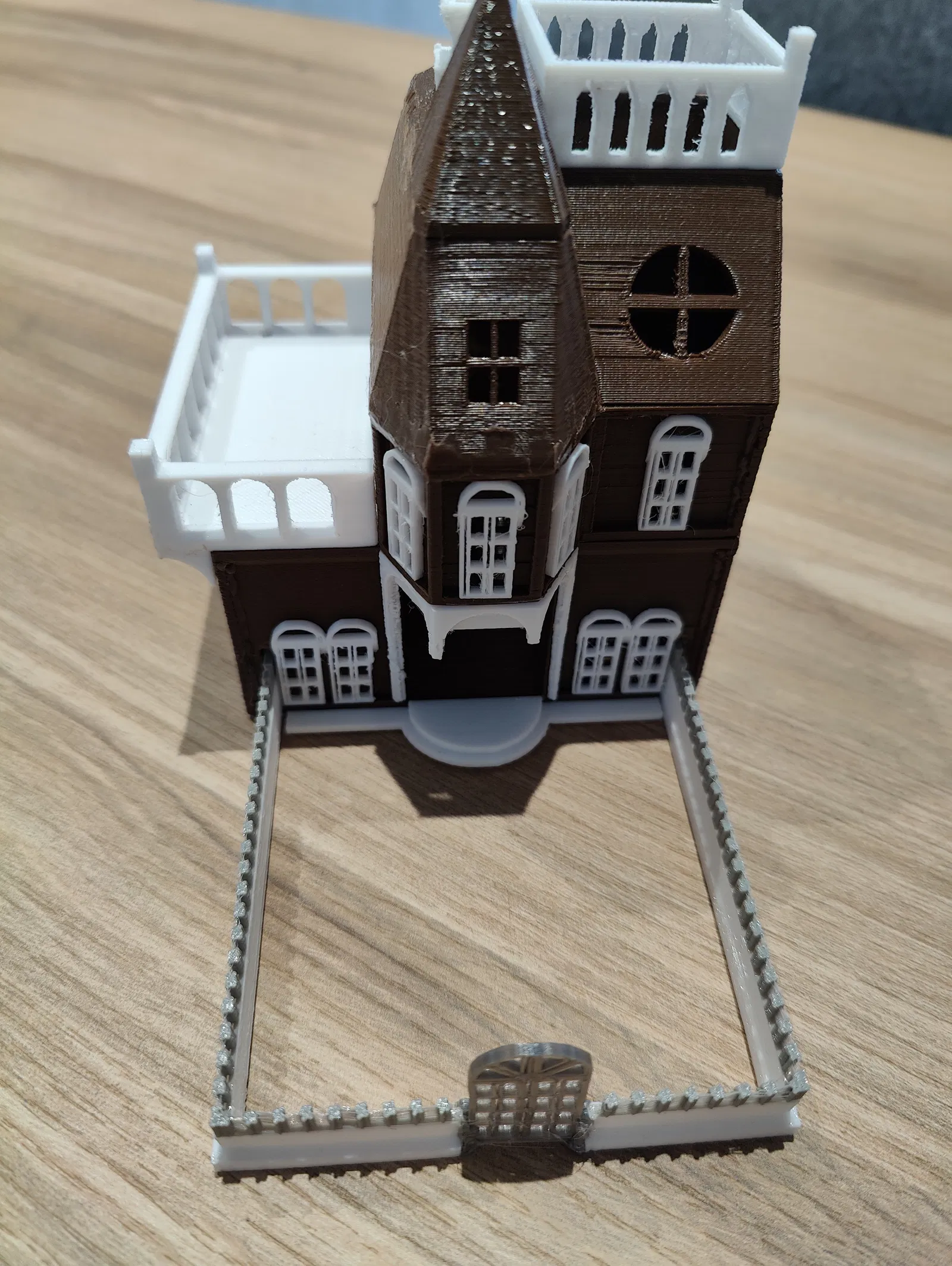 Lưu ý: Các bộ phận giữ hàng rào cần được dũa để chúng trượt vào bên trong, ban công cũng cần được dũa để giữ tám viên xúc xắc. Có thể bạn cần cắt ngắn các cột cổng để xúc xắc rơi tốt hơn.