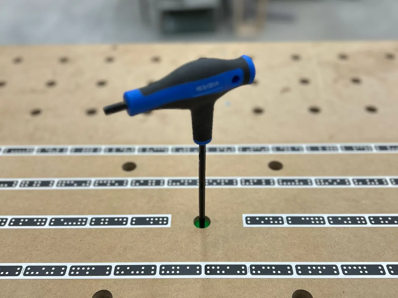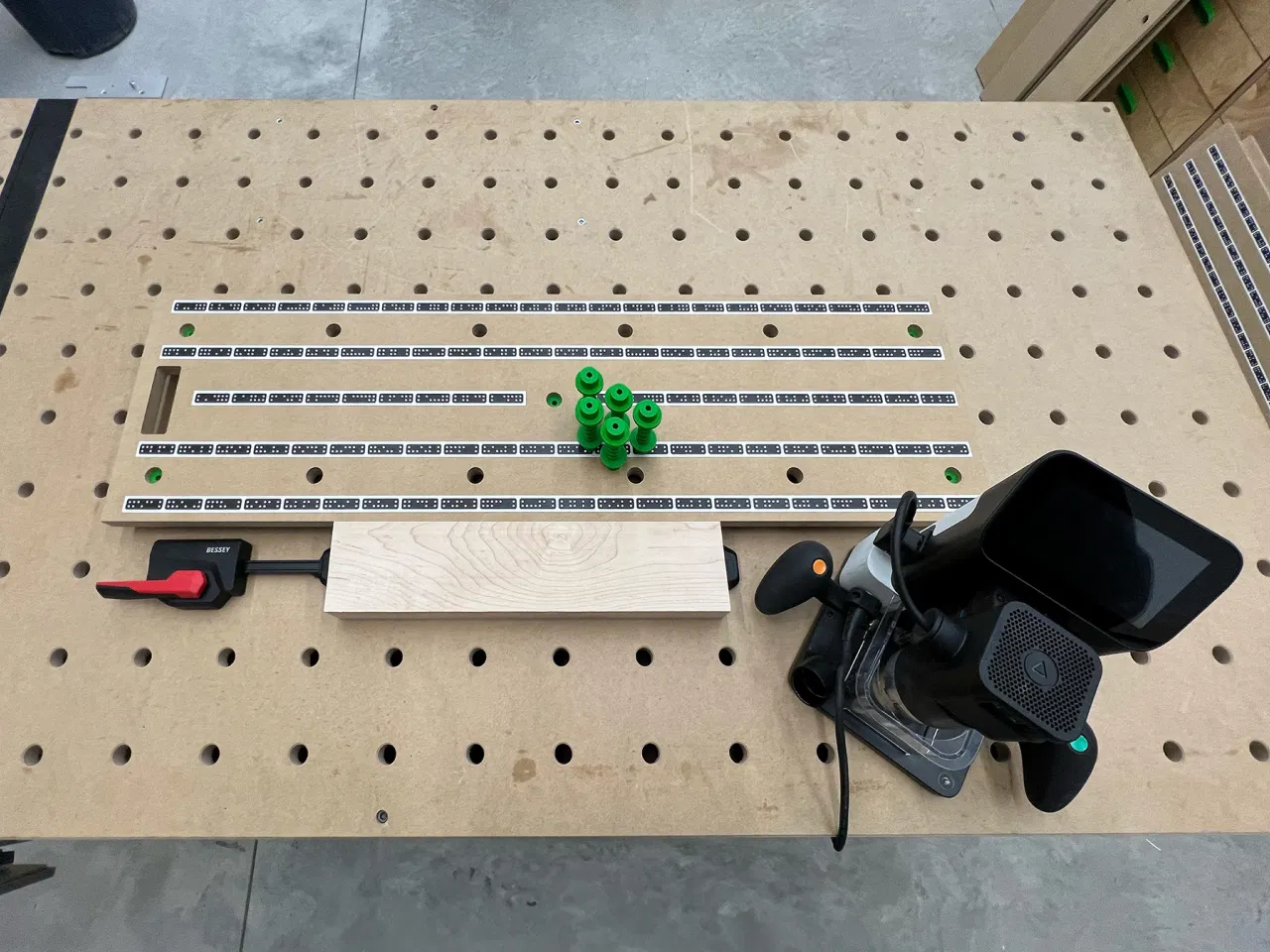 Nói chung, đây là một giải pháp linh hoạt và có thể dùng cho thước dây với mọi kích thước. Cứ làm theo bố cục tiêu chuẩn công nghiệp là được, miễn là đảm bảo các lỗ tròn 20mm phay trên thước dây cách nhau 96mm theo tâm. Dùng bao nhiêu bộ Nâng Thước Dây (Tape Board Riser) tùy thích để hỗ trợ đầy đủ là xong – có ngay một bề mặt thước dây tự đăng ký, chỉnh được độ cao, nhanh chóng tinh chỉnh, không cần kẹp và dễ dàng cất giữ khi không dùng.