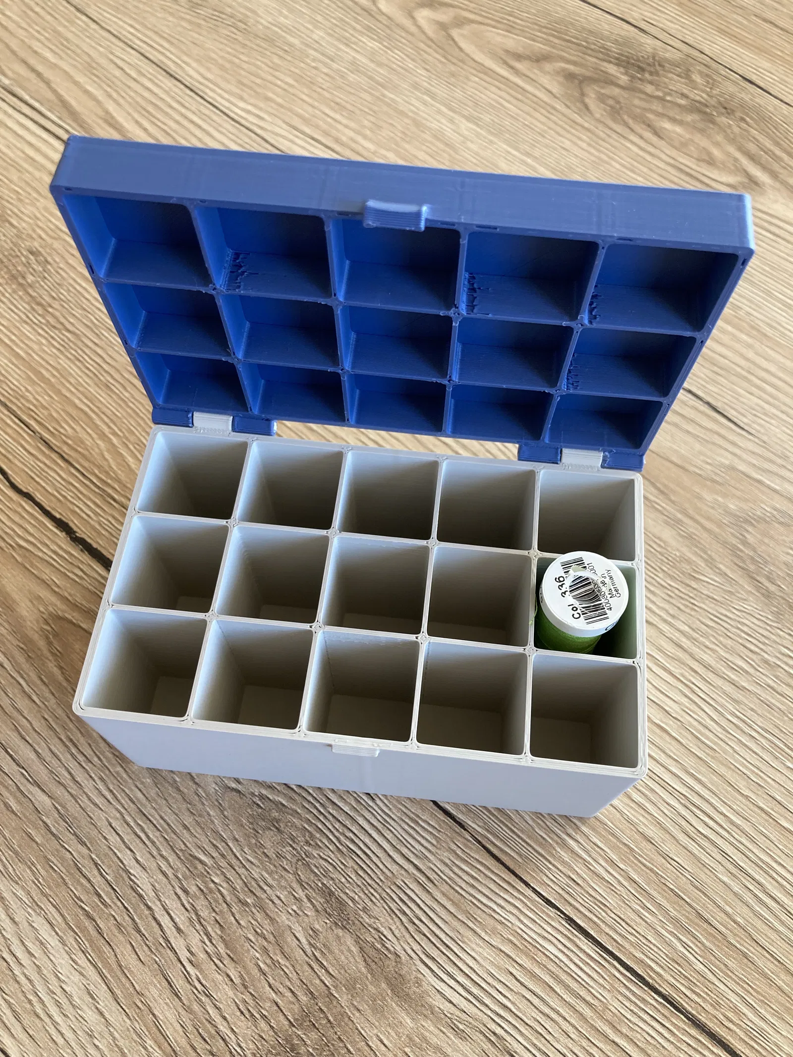 Hộp đựng 15 suốt chỉ may, gồm 2 phần là hộp và nắp. Dùng sợi filament 1.75 mm để nối hai bộ phận lại với nhau. Thích hợp cho người hay may vá, giúp bảo quản suốt chỉ gọn gàng.