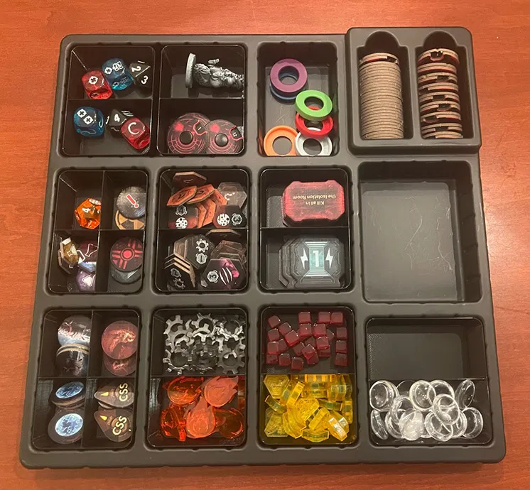 Khay đựng giúp sắp xếp gọn gàng các mảnh ghép và token trong game Nemesis Lockdown. Khay mỏng, in nhanh, đủ bền và có thể lấy ra khi chơi game. Rất hữu ích cho việc tổ chức lại các phụ kiện trong game.