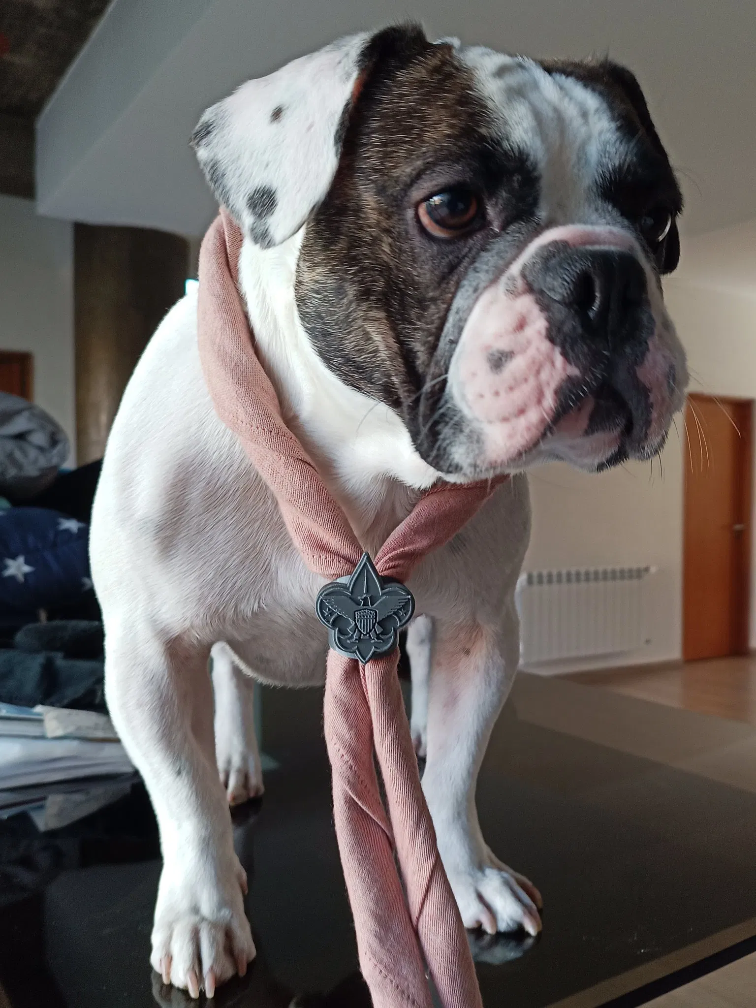 Chỉ trong trường hợp bạn tò mò, con chó là Rocco. Nó là một chú chó bulldog Pháp nhưng nó cũng yêu Boy Scouts của Mỹ!