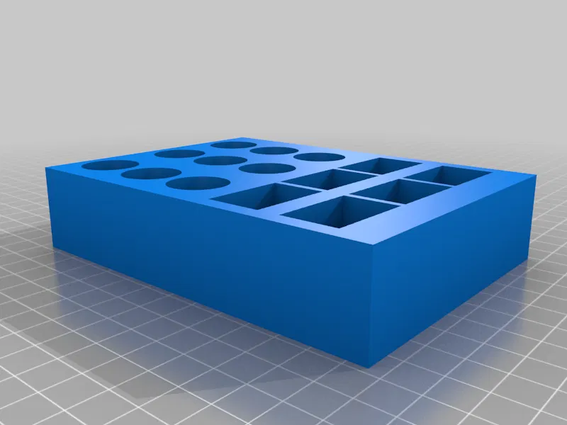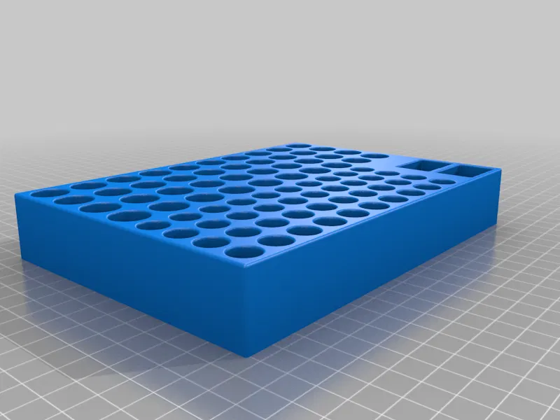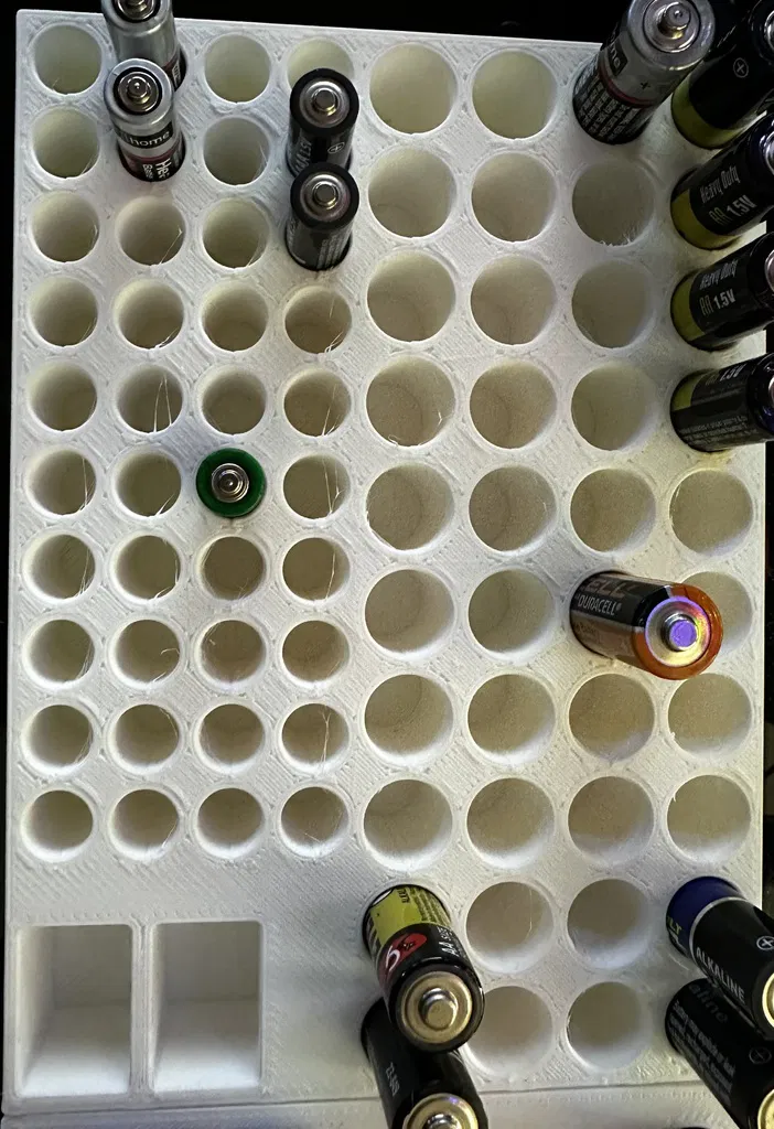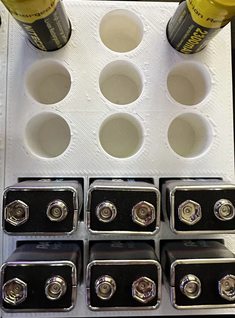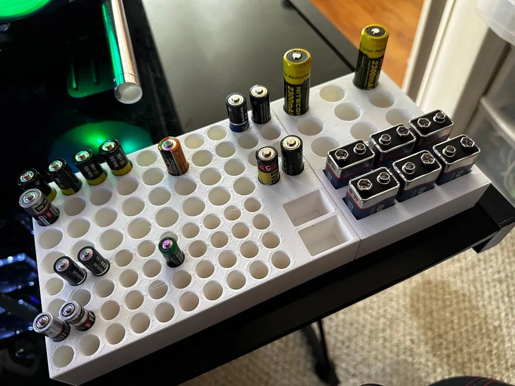 • Tệp STL thứ hai là phiên bản cắt giảm của khay pin AAA, AA và 9V. Khay này giữ 40 pin AA, 40 pin AAA, và cũng giữ 2 pin 9V. (Khay này có kích thước 5" Rộng x 7" Dài)