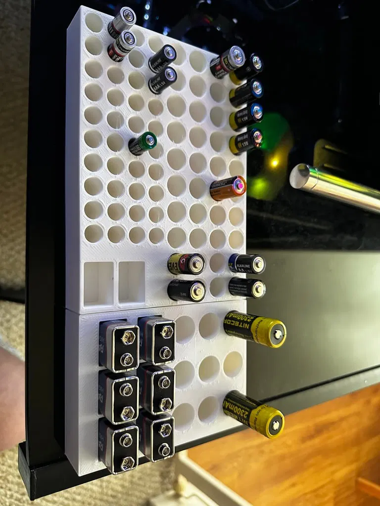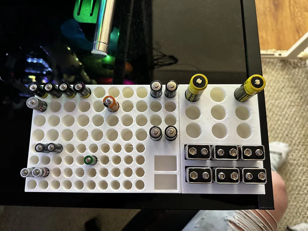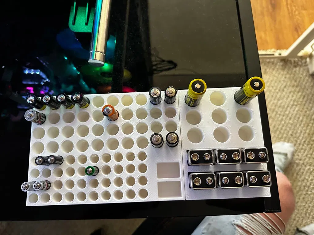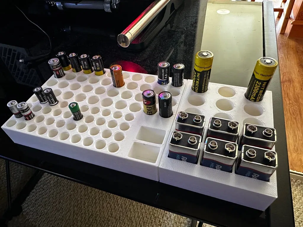 Tui làm 2 khay pin này để vừa với ngăn kéo đặc biệt của tui. Tui làm cả hai khay có kích thước cụ thể để phù hợp với nhu cầu và bản in, rồi dùng keo nến ghép lại. Tui đăng lên cho ai có nhu cầu lưu trữ pin và kích thước tương tự.