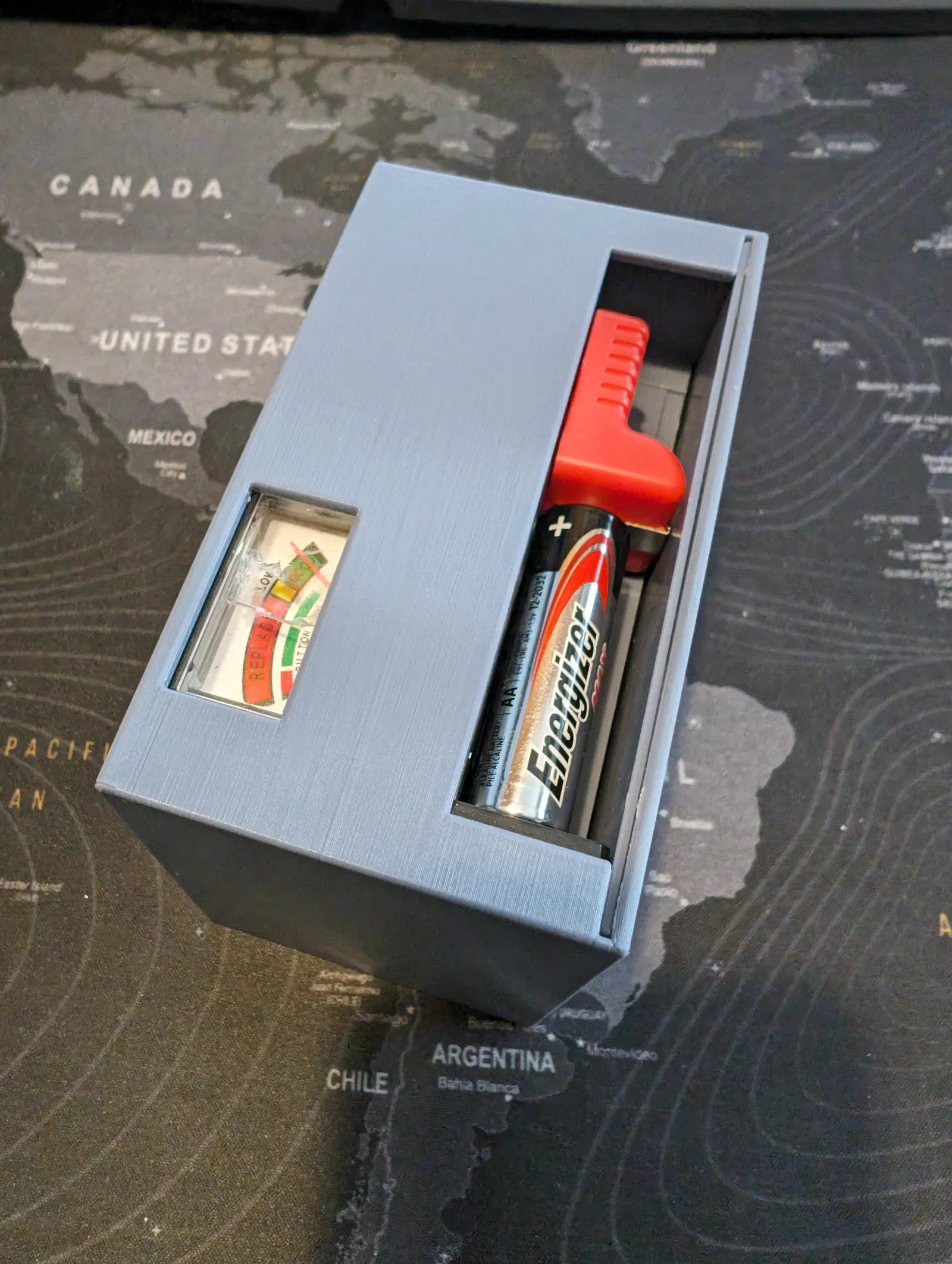 Chiếc hộp có một khe cắm để vừa một máy đo pin analogue đơn giản, cái tôi dùng là từ Amazon.