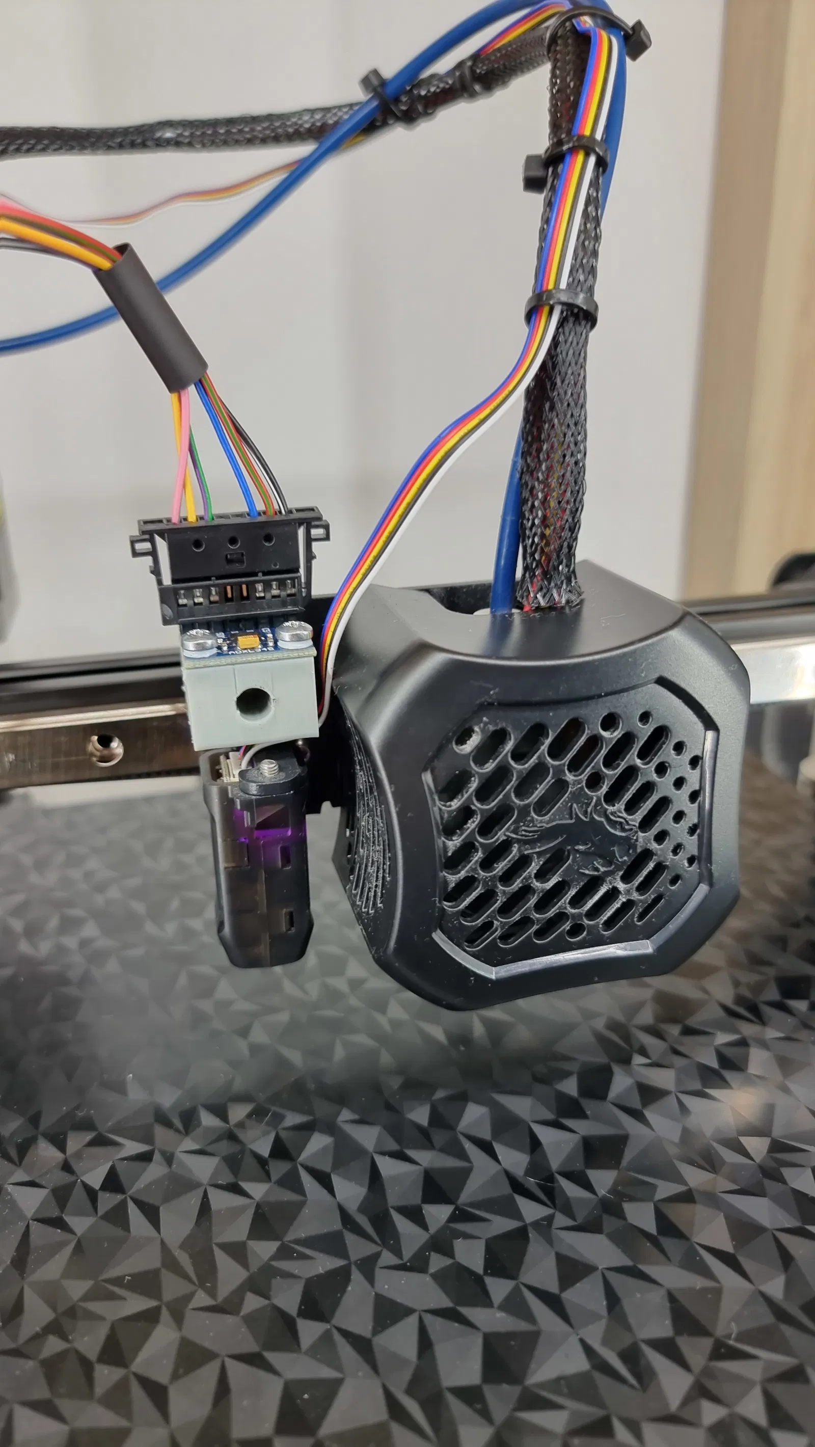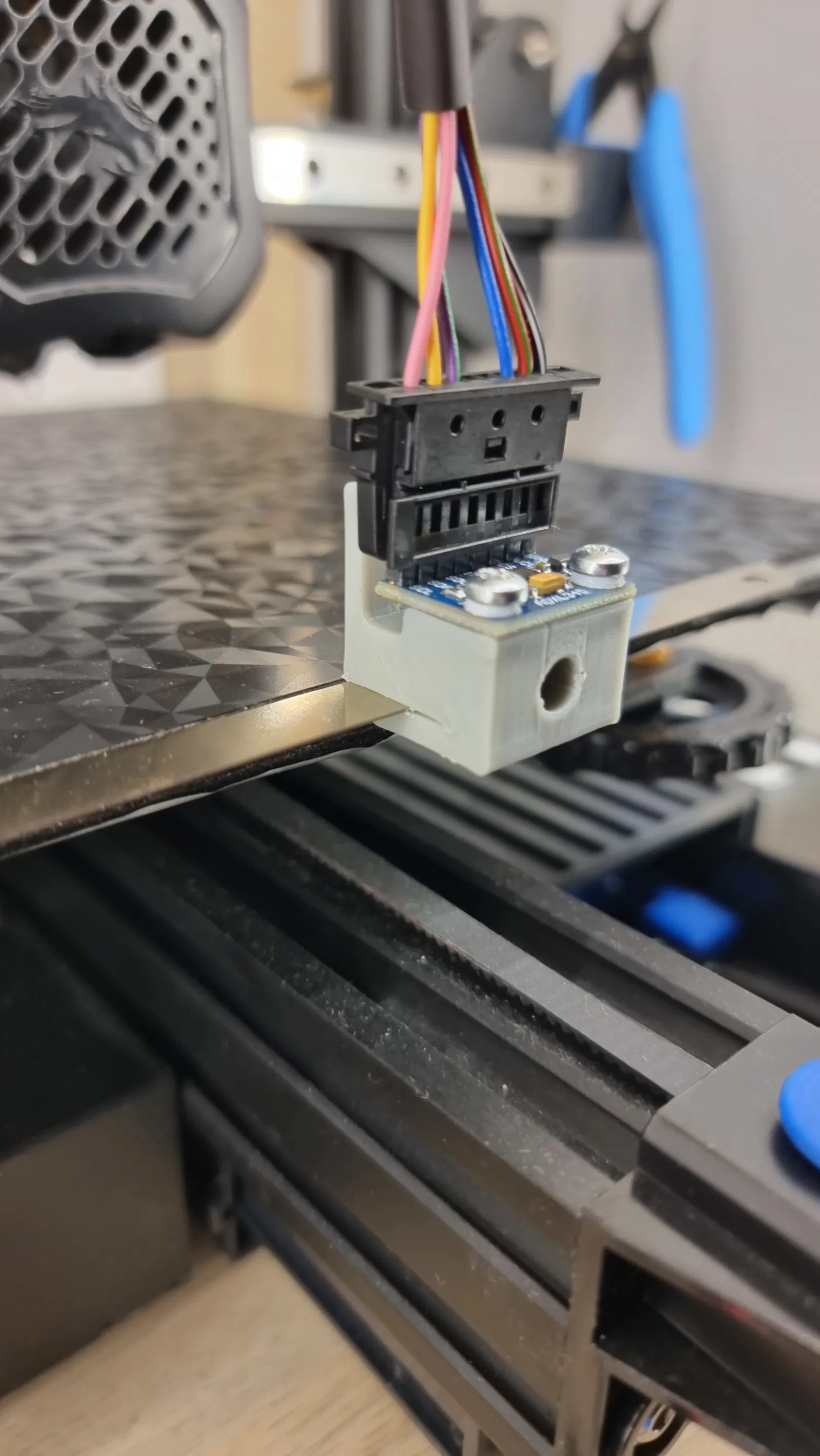 Ở trục Y, chỉ cần kéo nó lên cái mâm in. Tương thích với mấy cái mâm in bán sẵn mà có cái phần lồi ra. Còn không có thì cứ đẩy mâm in ra phía trước là được. Nó có thể gắn dễ dàng vô trục X bằng con ốc trên của cái CR/BL touch. Không cần phải mua ốc với ren gì thêm đâu.