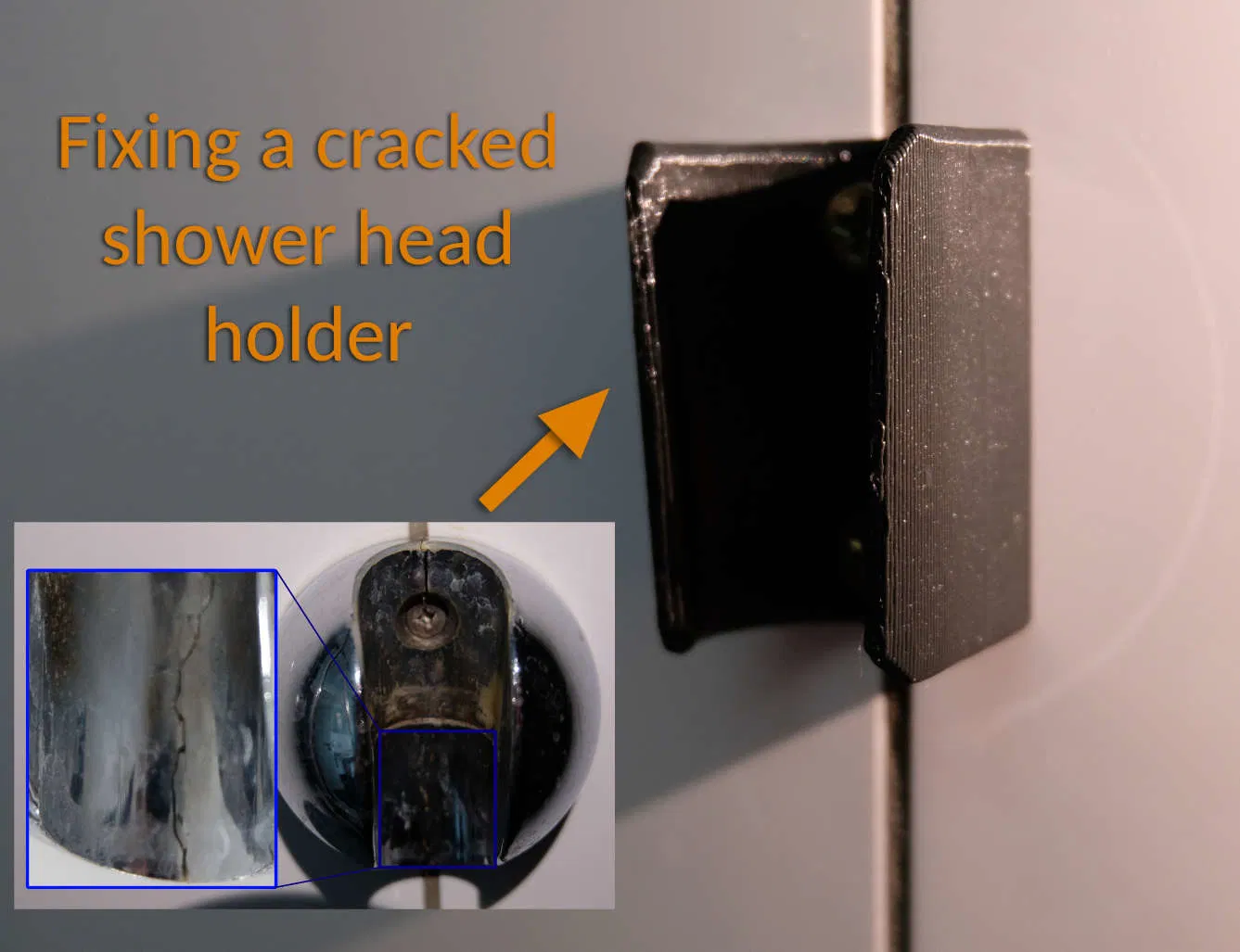 Giá đỡ vòi sen bị lỏng và lung lay, sau khi siết lại thì bị nứt. Đồ thay thế này tận dụng lỗ bắt ốc thứ hai và có thể tùy chỉnh dễ dàng bằng file Fusion 360. In bằng PETG nằm ngang hoặc PLA đứng lên, chú ý khi siết ốc.