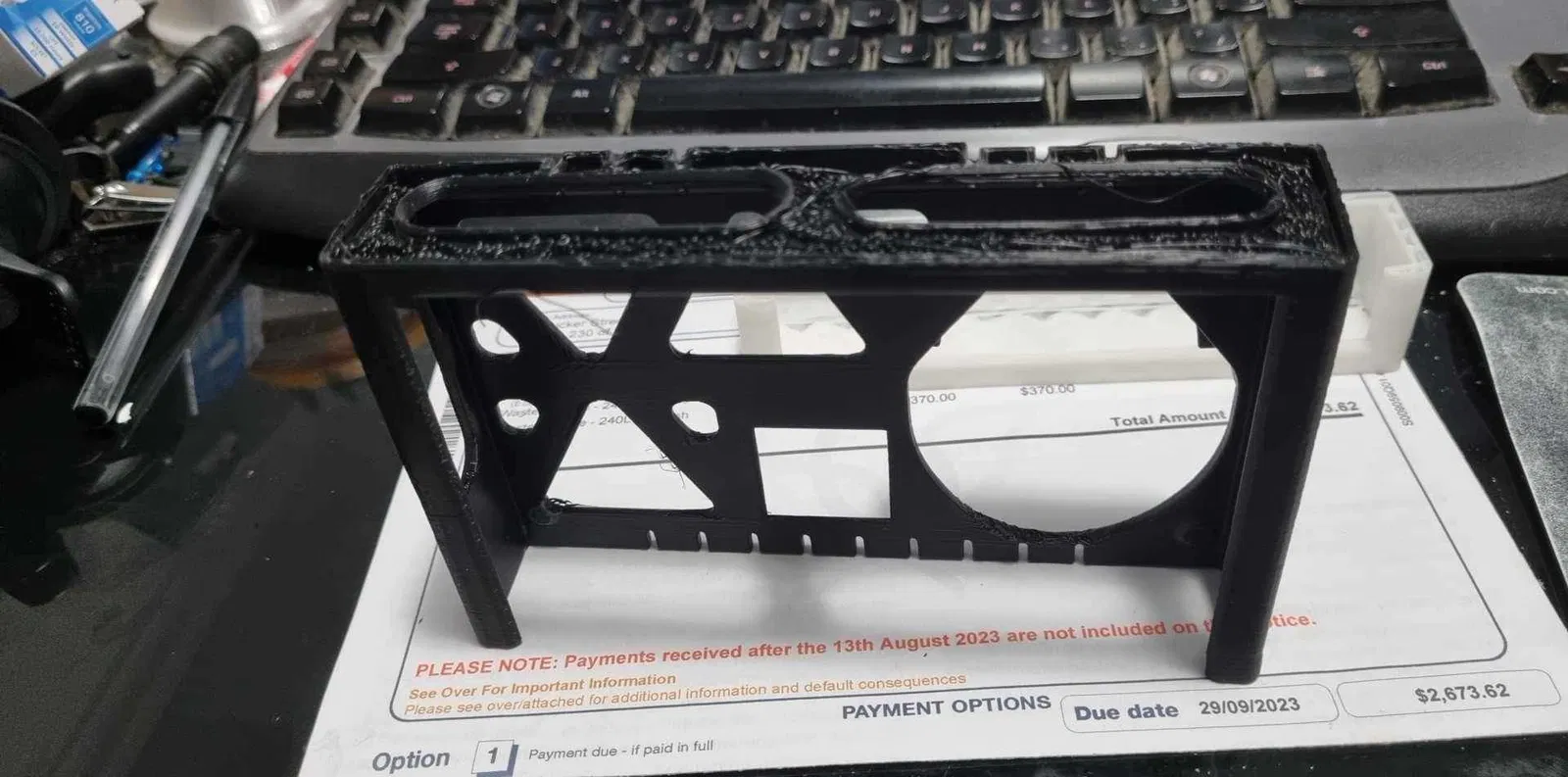 Nên in bằng nhựa ASA để hạn chế bị biến dạng khi nóng. Vừa khít, các gờ nổi vào các khấc vít nguyên bản cần phải dùng lực khi tháo vỏ. Trên cái này, đã thay keo/băng keo hai mặt dùng để gắn đĩa kim loại vào vỏ vật phẩm bằng băng keo hậu mãi dày khoảng 1.5mm và hơi đàn hồi để nam châm kẹp vào vỏ in tốt hơn.