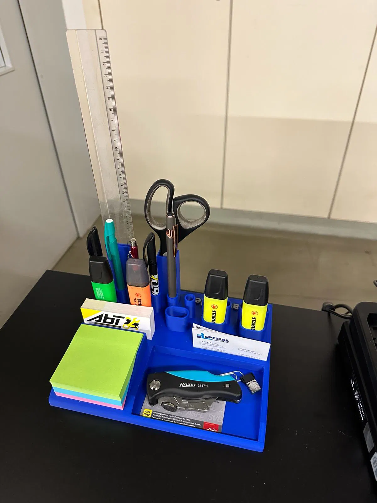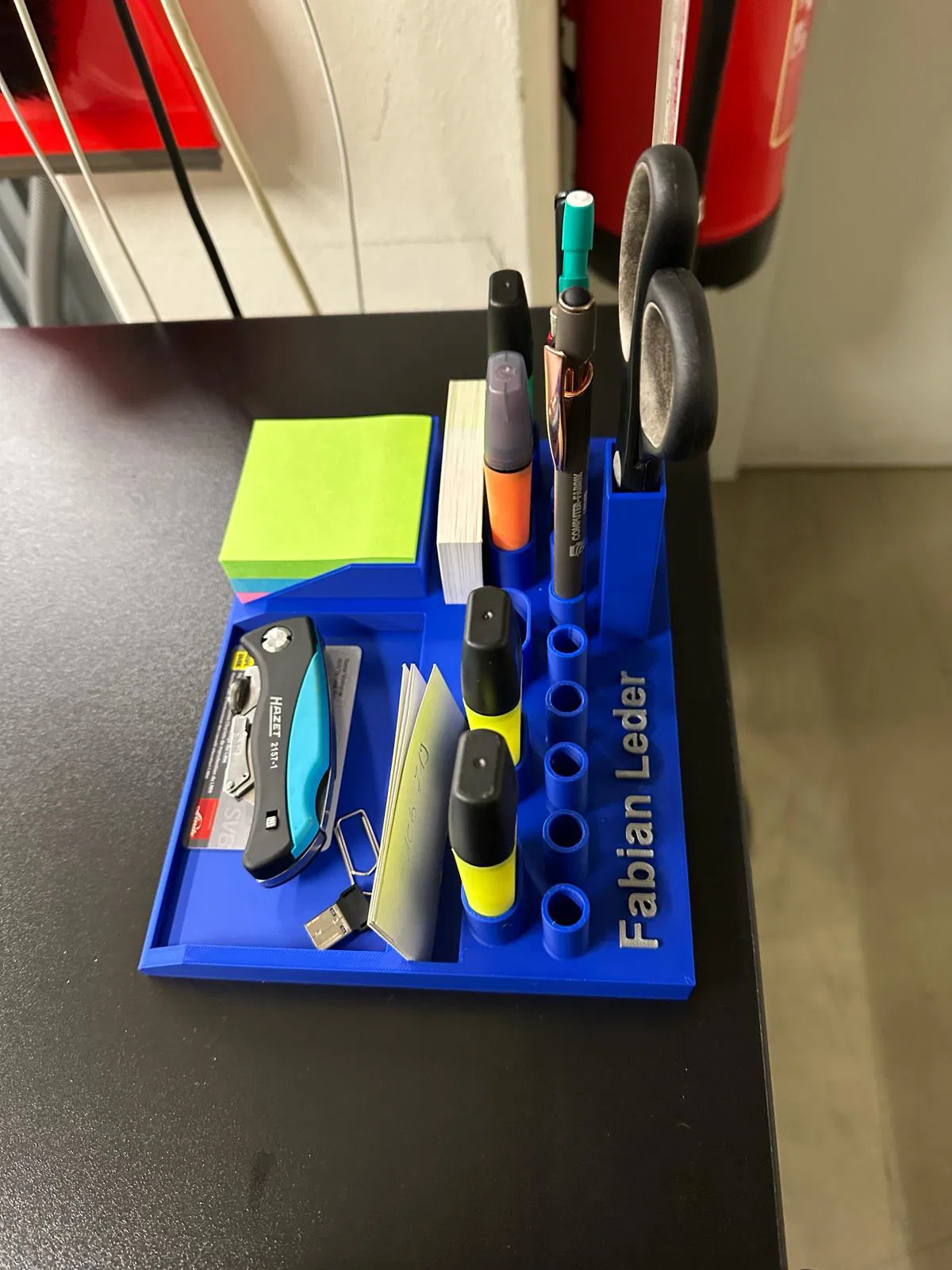 Mẫu kệ đựng đồ văn phòng này có đủ không gian cho mọi loại vật dụng cần thiết. Được in bằng PLA, với infill 15%, thời gian in khoảng 7 tiếng. Có thể tùy chỉnh tên ở góc sau.