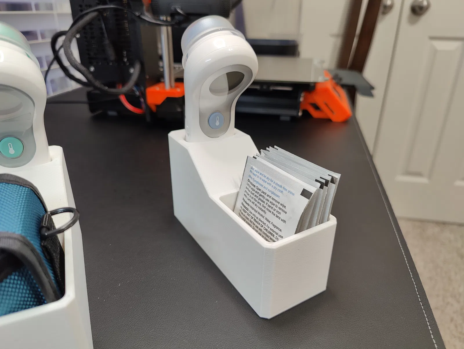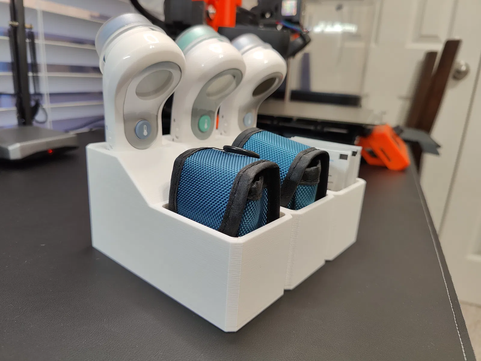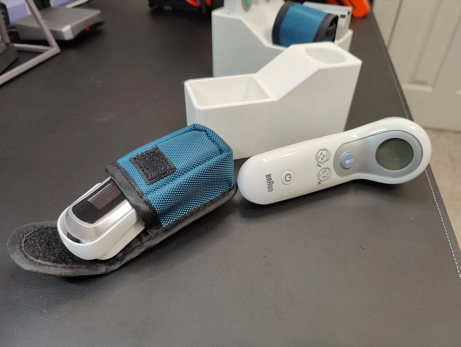 Giữ nhiệt kế đo trán Braun No Touch và một máy đo oxy trong máu hoặc khoảng 20 miếng tẩm cồn. Phù hợp cho gia đình và phòng khám. In bằng PLA hoặc PETG.