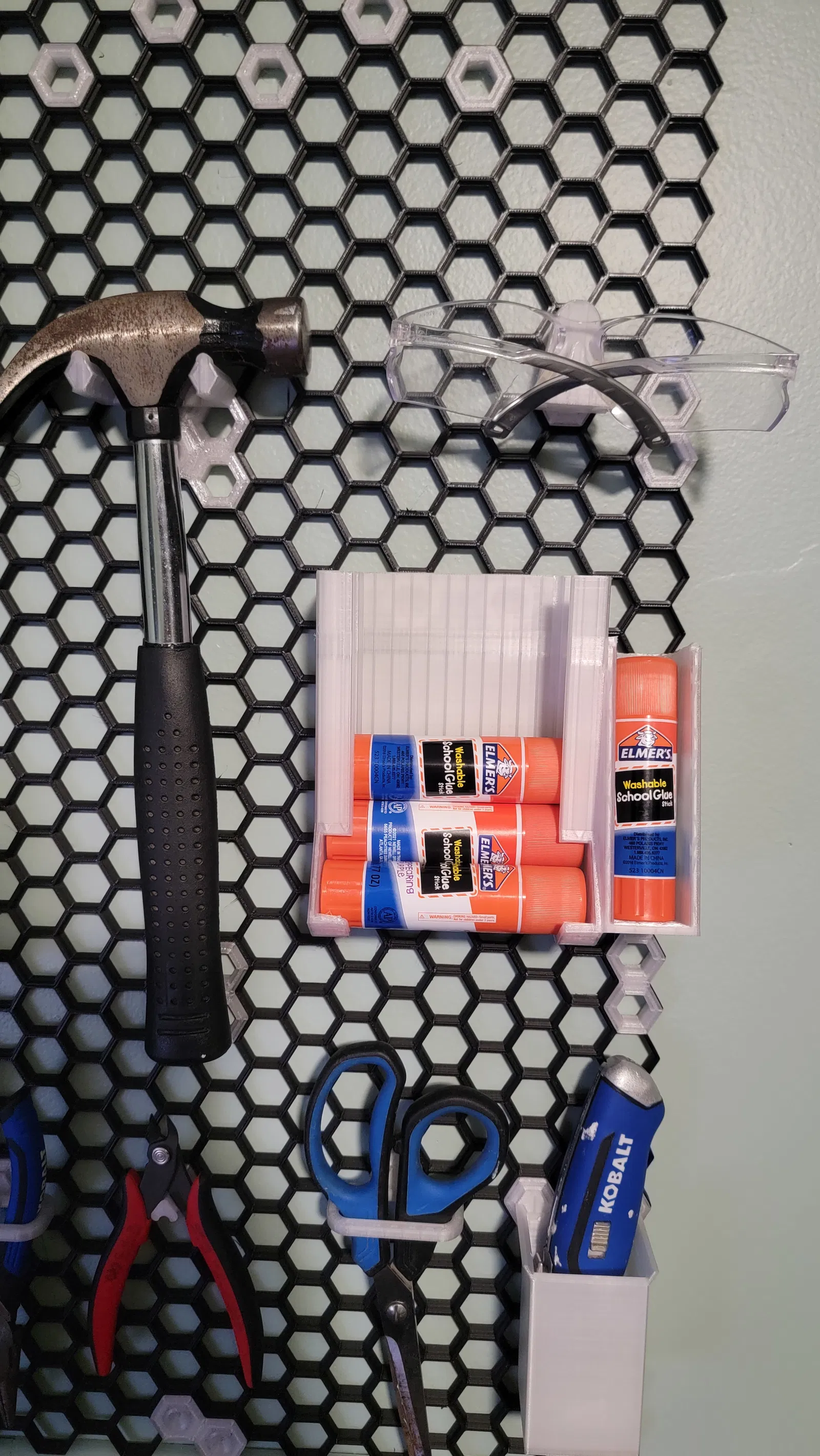 Dụng cụ đựng keo dán dạng thỏi được thiết kế riêng cho hệ thống treo tường HSW, với khả năng chứa 6 cây keo Elmers Giant Purple, tương đương 2 vỉ 3 cây. Bản in ngược bằng PETG tái chế cho ra thành phẩm sắc nét.