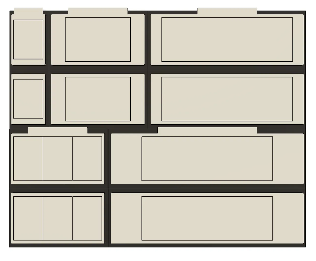 Có hai loại cho mỗi loại trừ loại Half-Size. Loại đầu tiên được làm vừa khít với kích cỡ của bánh mì và sẽ chiếm ít không gian pegboard nhất. Loại thứ hai được làm đồng đều kích cỡ để mấy cái module xếp với nhau cho gọn. Đây là mấy cái phiên bản "v2" đó nha.