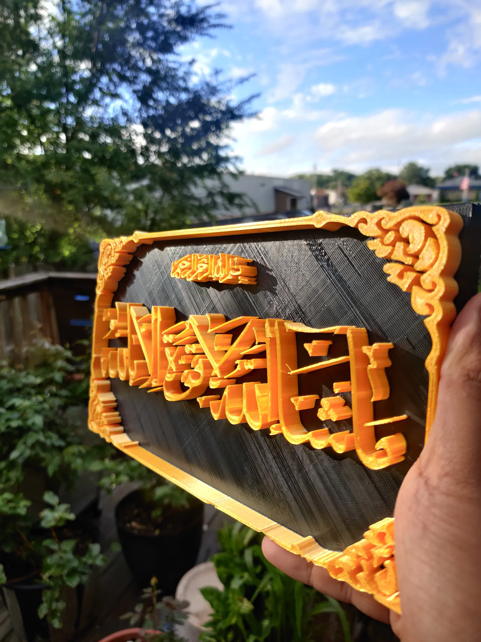 Tui có làm một cái mẫu 3D hình cái đĩa có khắc chữ Hồi giáo, câu "Mashallah La Quwwata Illa Billah" đó quý vị.