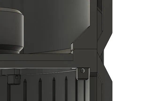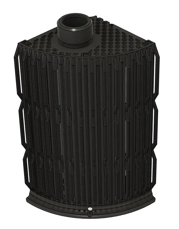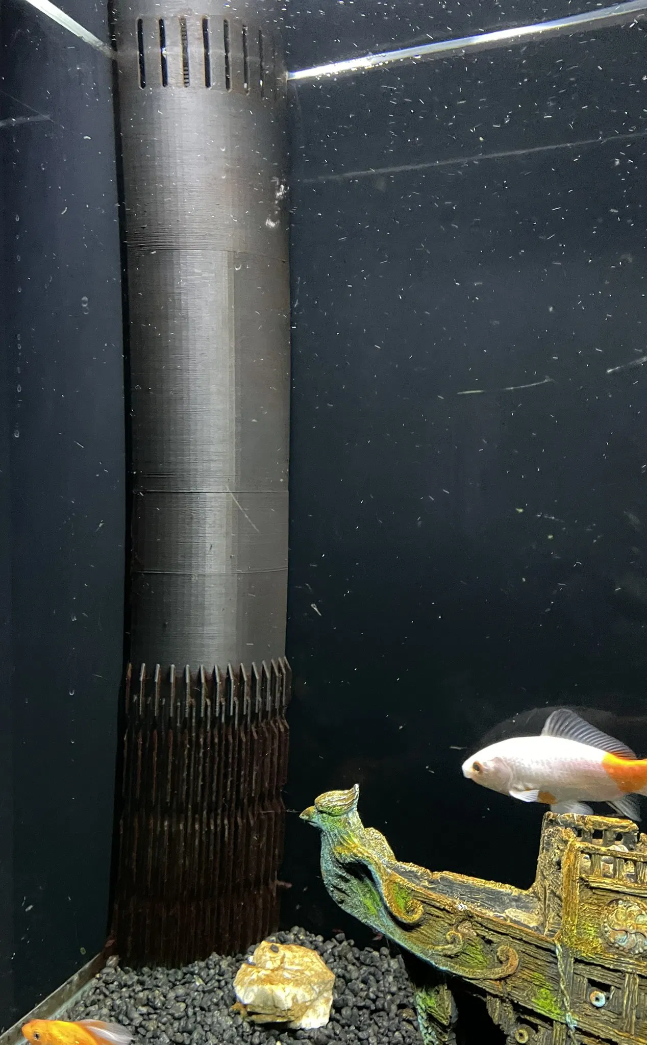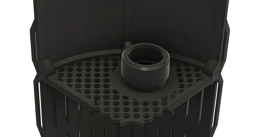 Thiết kế này được tạo bằng Fusion360, tạo thành một cột hình tư của hình tròn (cao 75cm) gồm 4 khúc ghép lại, giúp che đi ống dẫn nước ra cho hệ thống lọc thùng bên ngoài. Nó cũng cung cấp một cách để luồn ống khí ẩn từ trên xuống dưới đáy bể.